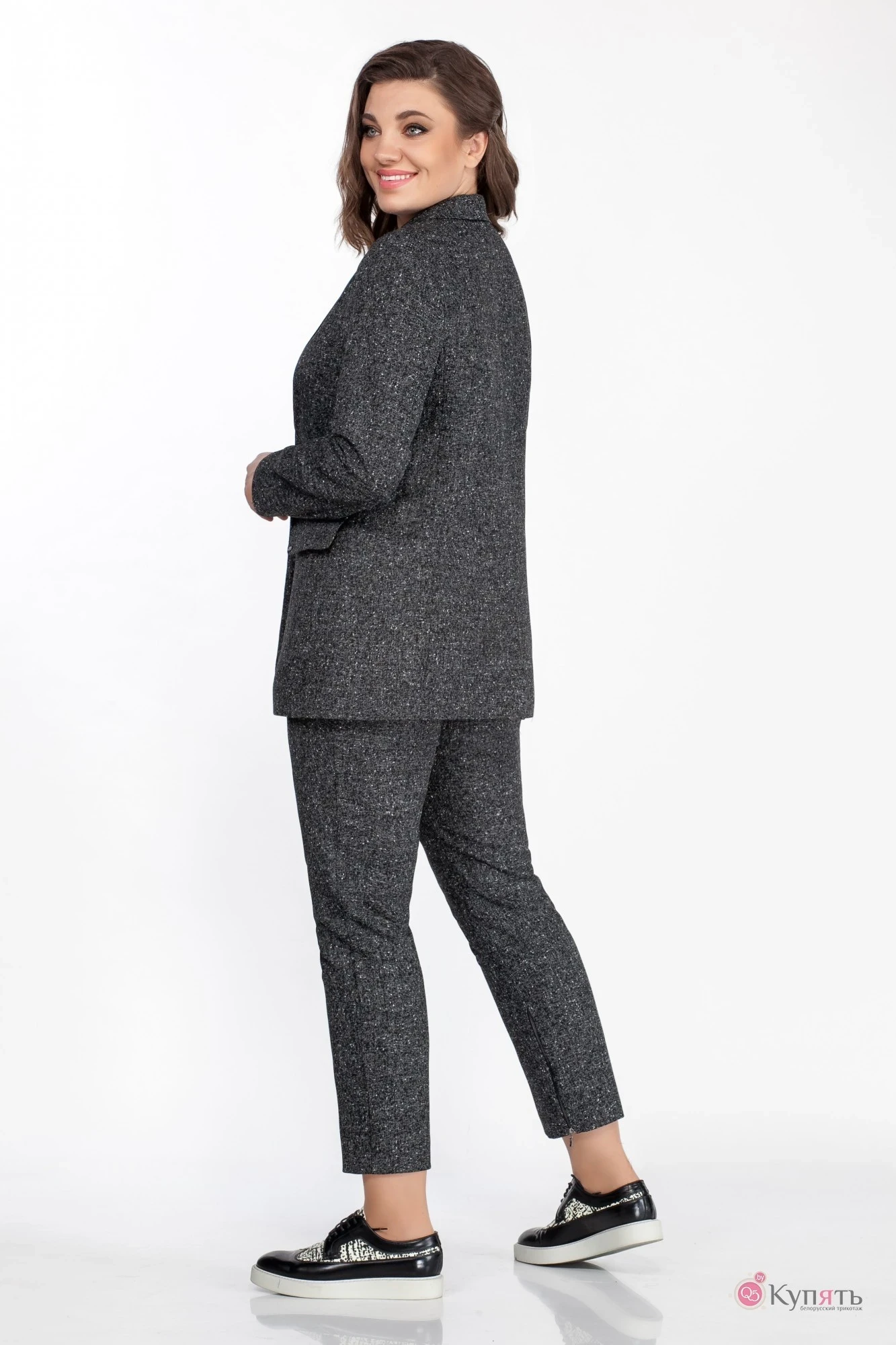Костюм женский двухпредметный из текстильной ткани. Жакет с отложным воротником с лацканами и прорезными карманами. Застежка на петли пуговицы. Брюки прямые, зауженные к низу, с карманами в боковых швах. По низу шагового шва выполнены функциональные молнии. Застежка брюк на молнию и пуговицу.