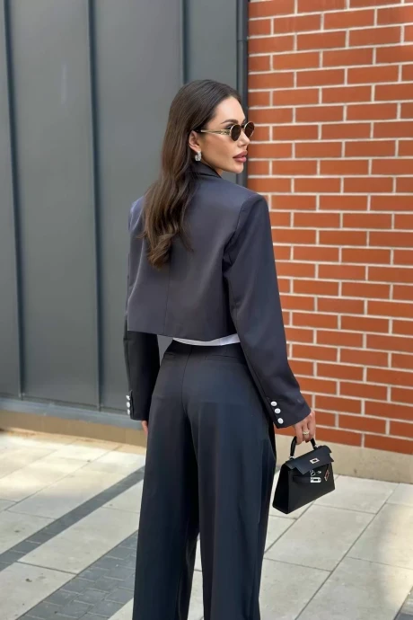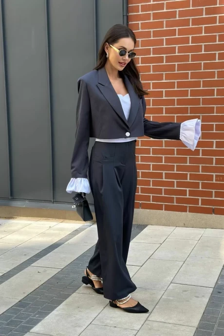 Брюки свободного кроя, по передним и задним половинкам обработаны прорезные карманы, вертикальные защипы по переду переходящие в складки зрительно вытягивают силуэт.