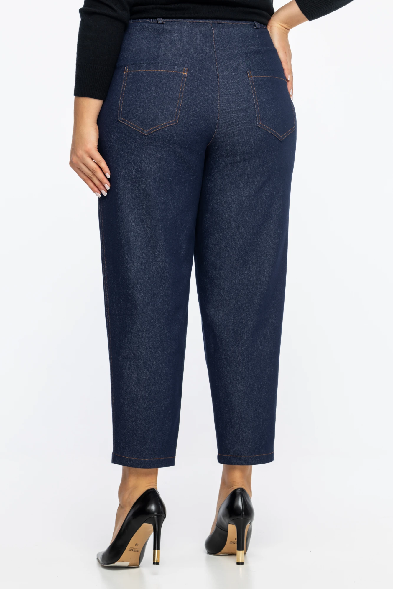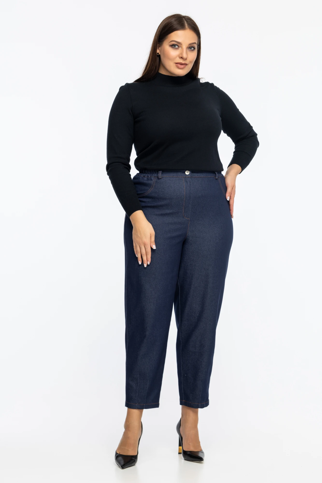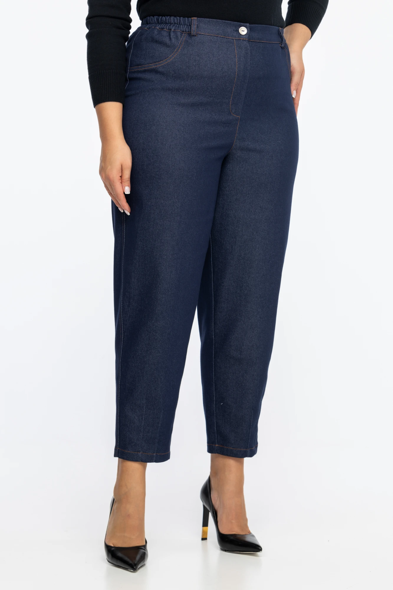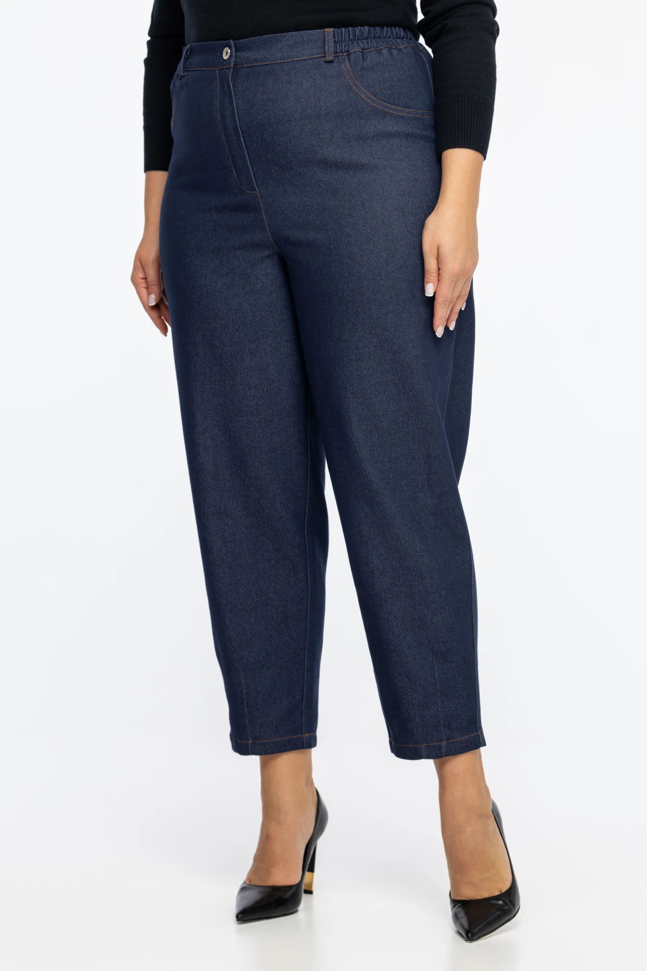 Стильные брюки из джинсовой ткани, свободного кроя, зауженные к низу. Высокая посадка, с элементом резинки по талии