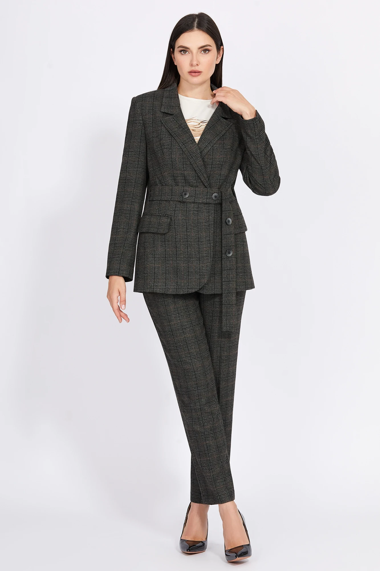 Элегантные брюки со стрелками- вытягивают фигуру. Модель на частично притачном поясе, собранном на эластичную тесьму по спинке, выполнена из приятной ткани с добавлением вискозы и ненавязчивым клетчатым рисунком. Акцентом в брюках являются отделочные пояски с отделочными пуговицам. Спереди застёжка на молнию и петлю-пуговицу и функциональные косые карманы. Сзади - два кармана с листочками.