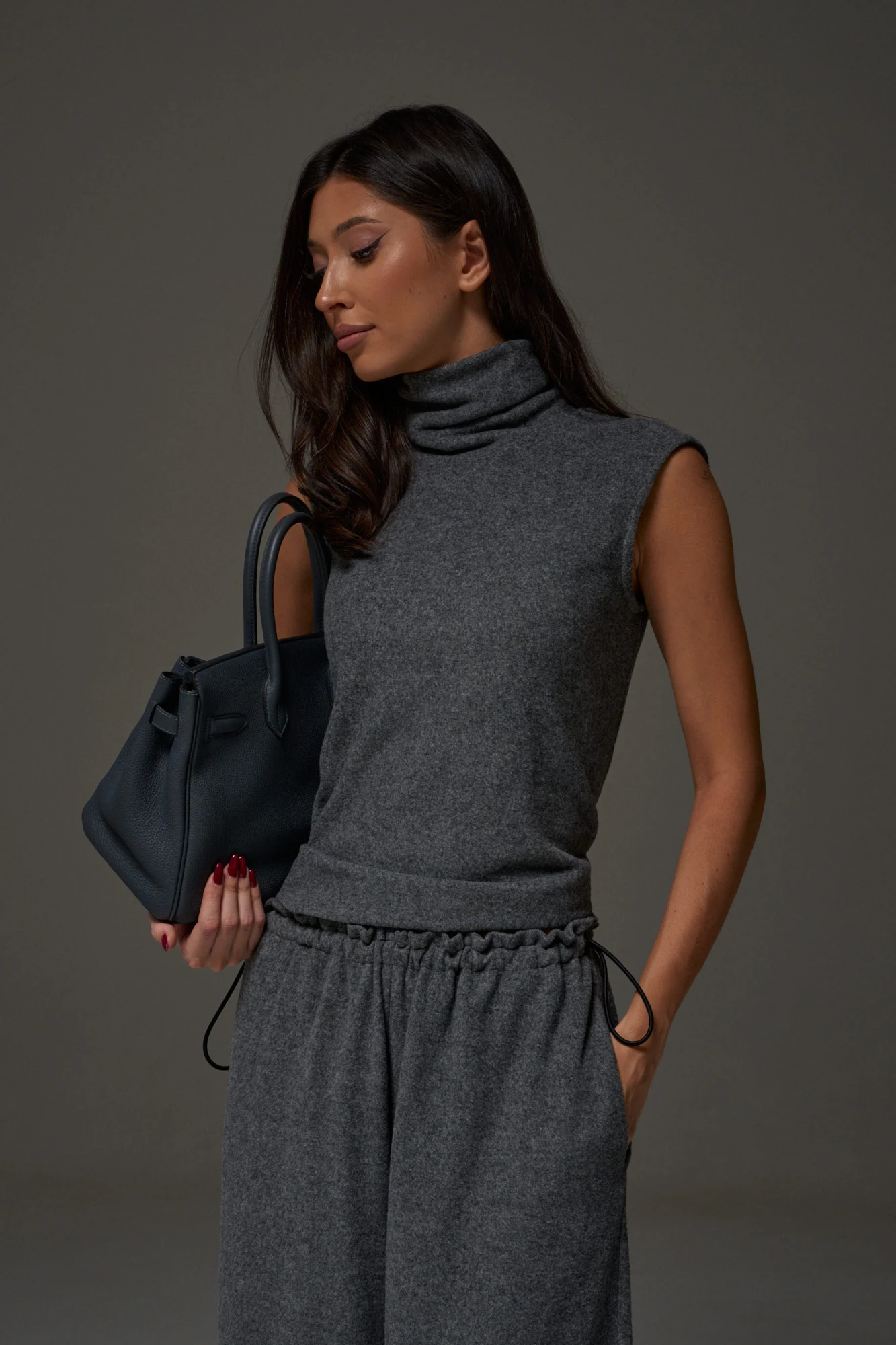 Брюки-джоггеры. Выполнены из мягкого ворсистого трикотажного полотна серого цвета. Характеристики: прямой крой, пояс на шнурке-резинке с фиксатором, в боковых швах карманы, штанина внизу на резинке с фиксатором. Длина 110 см.