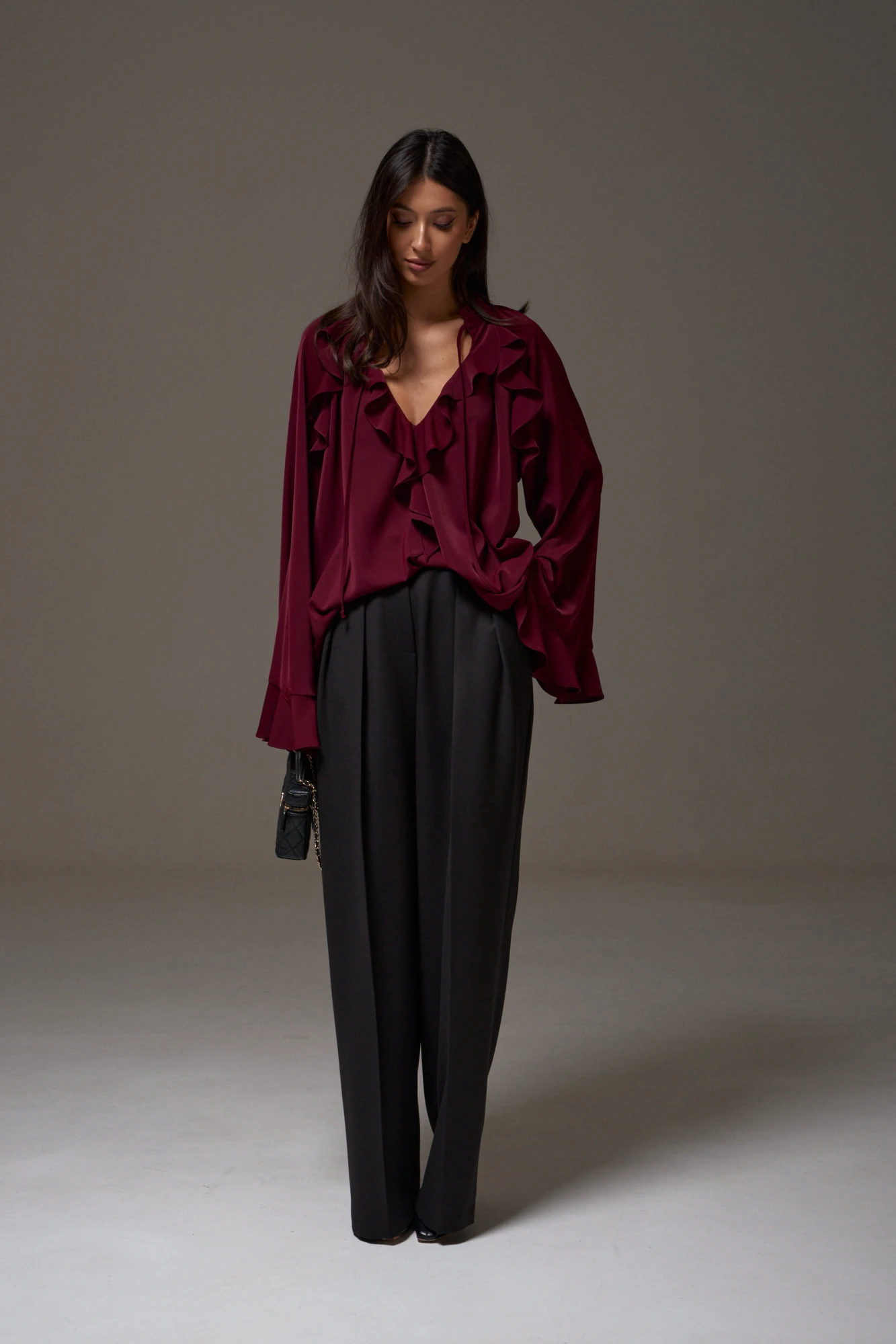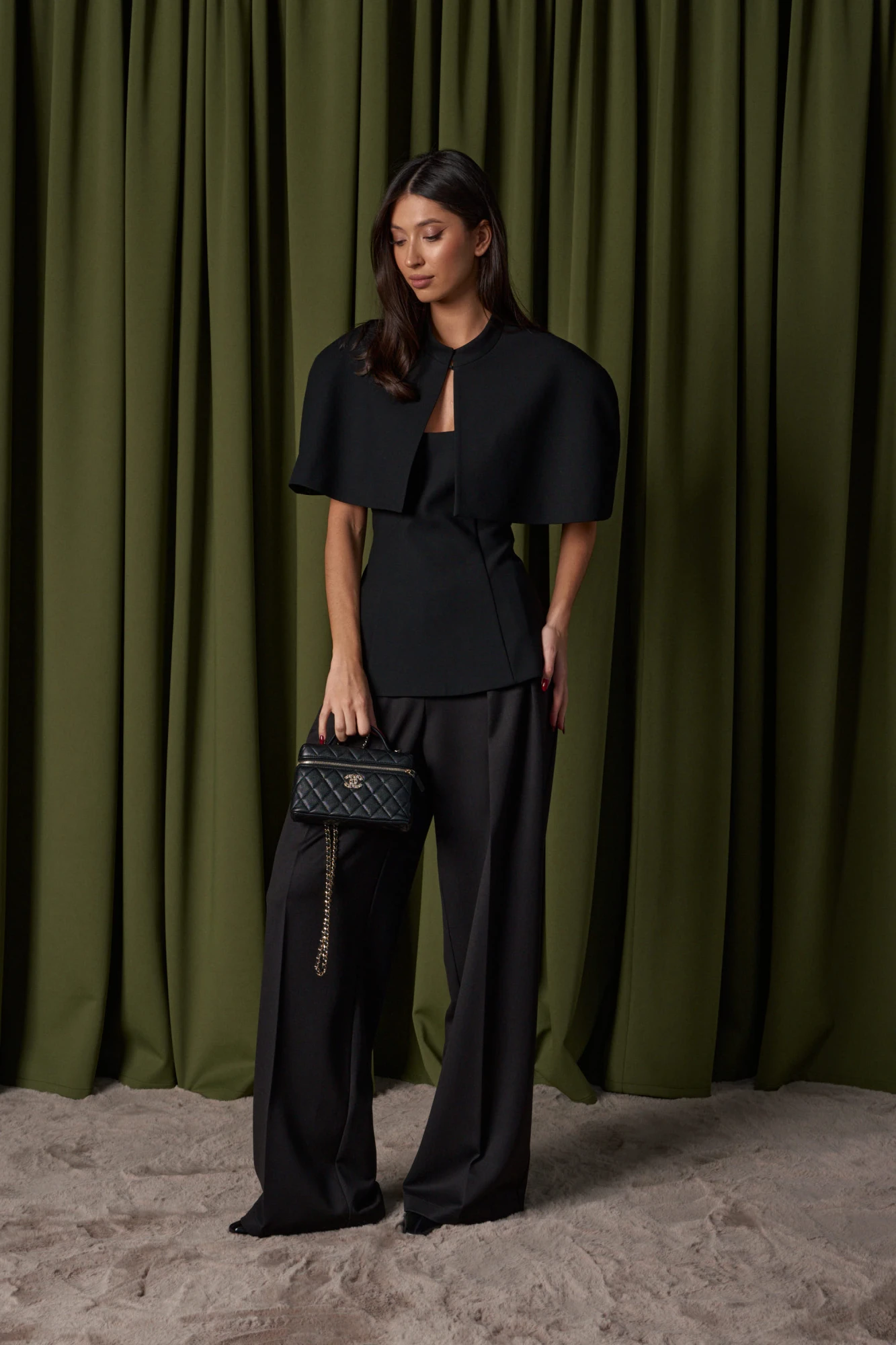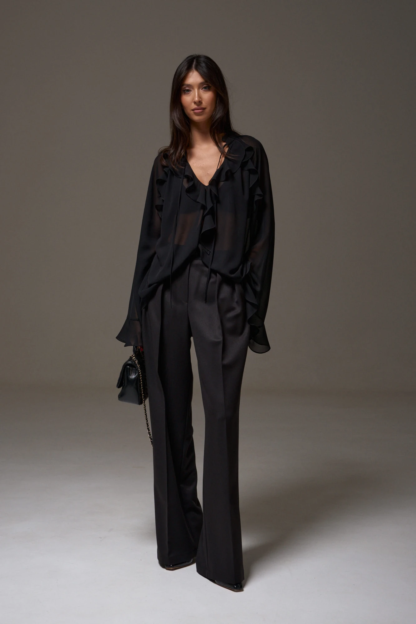 Брюки прямого кроя выполнены из ткани черного цвета.Характеристики: прямой крой, эластичная брендированная резинка, боковые карманы, на передней и задней частях брюк застрочены складки и заутюжены стрелки. Длина брюк 112 см