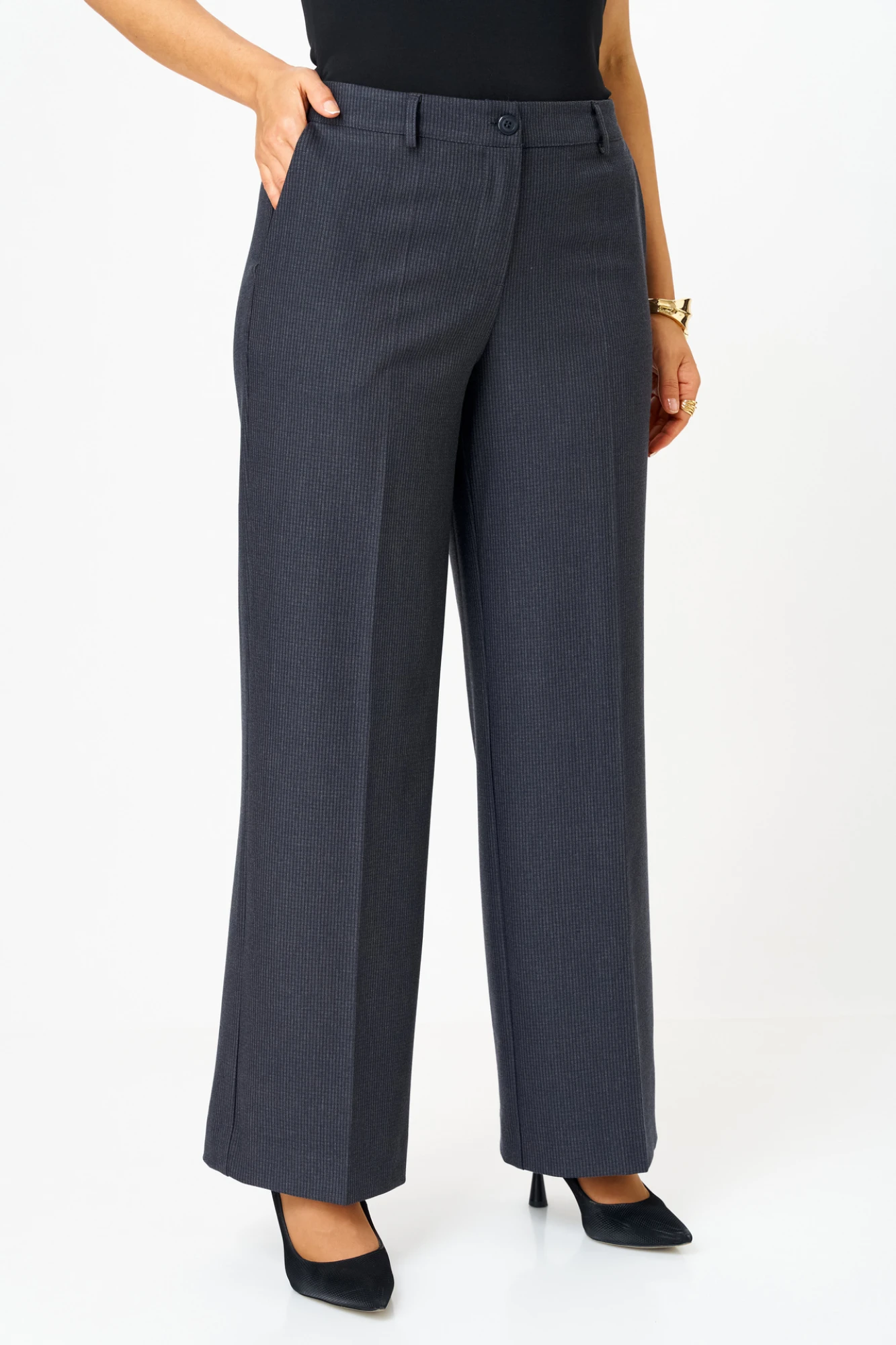 Брюки-палаццо, модель идеального кроя, создает изящный силуэт и невероятный комфорт. Скрытые карманы и фасон с высокой талией делают их одновременно стильными и практичными. Длина брюк от талии по боковому шву 103 см.