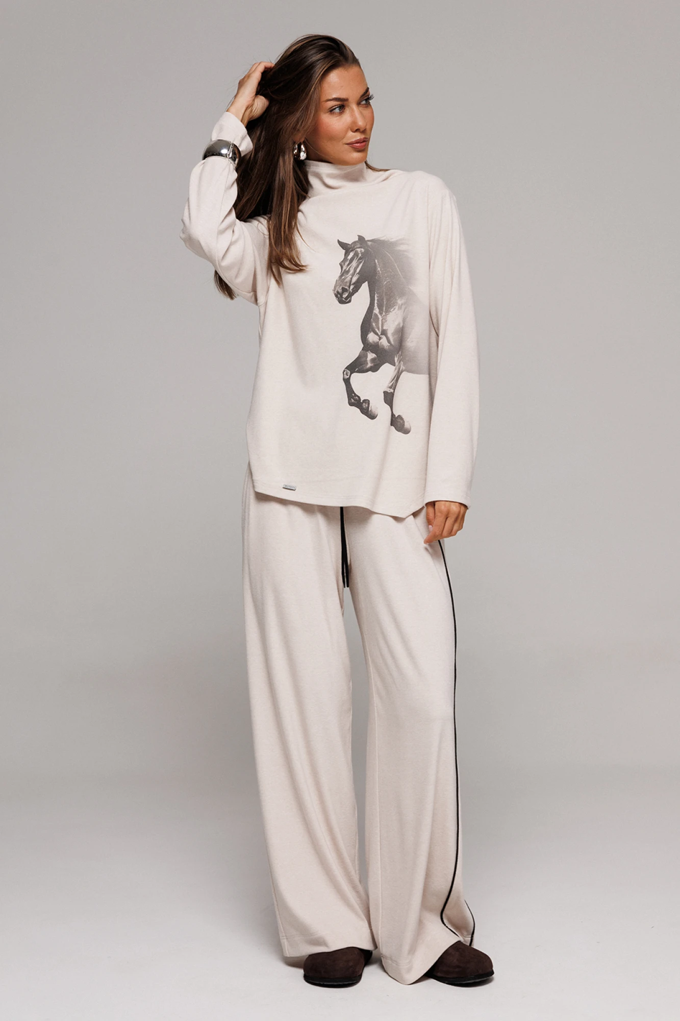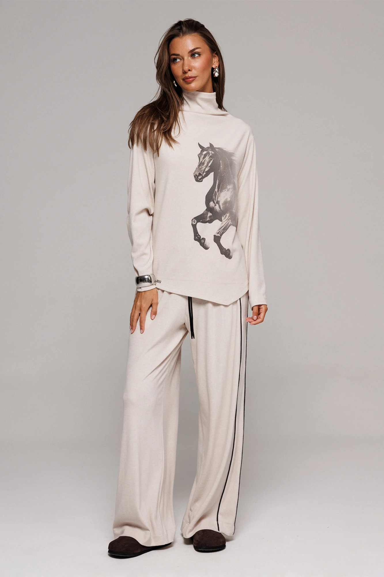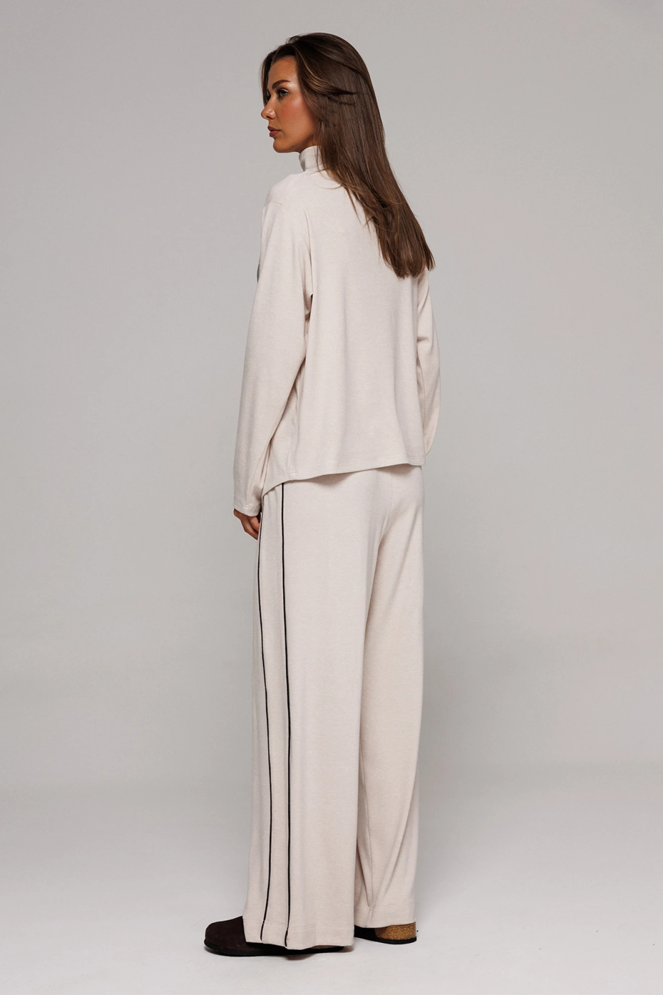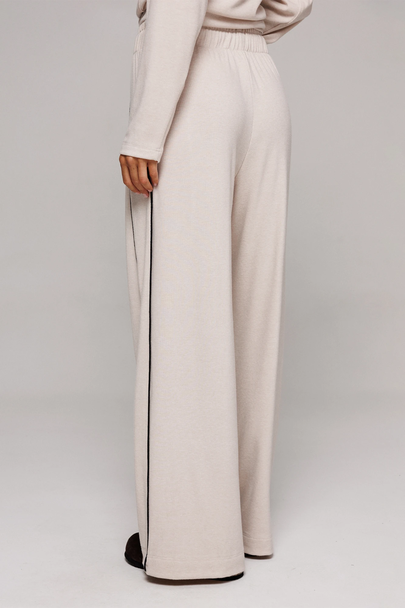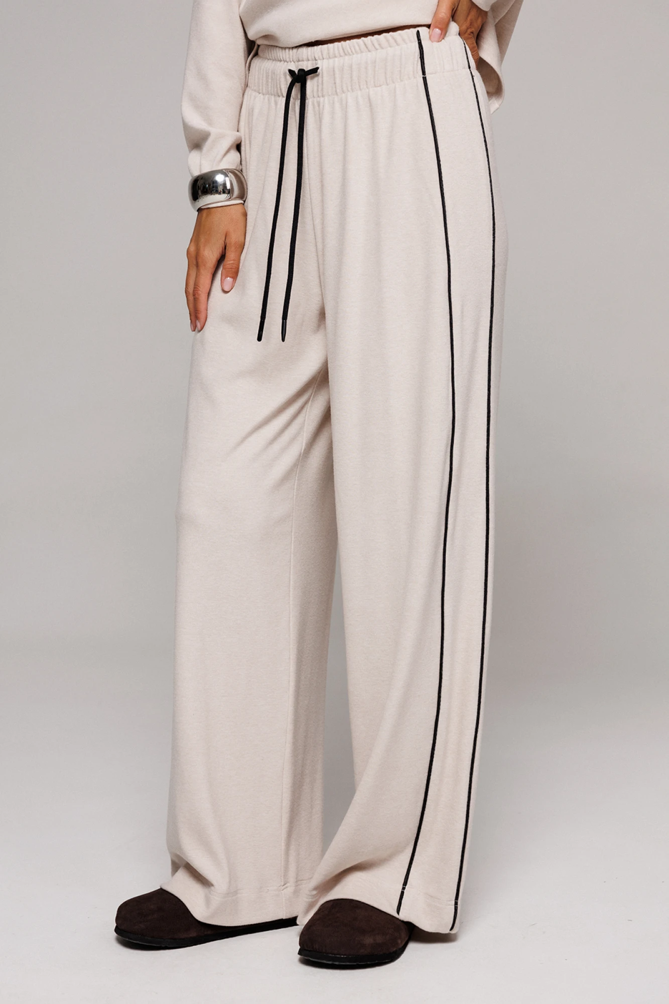Брюки из трикотажного полотна прямого силуэта на цельнокроеном отстроченном поясе со вставленной в него резинкой и декоративным шнурком. Справа отрезной бочок с кантом, слева в боковом шве карман.