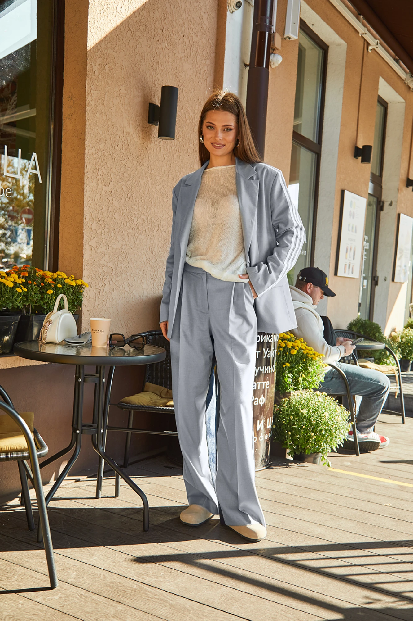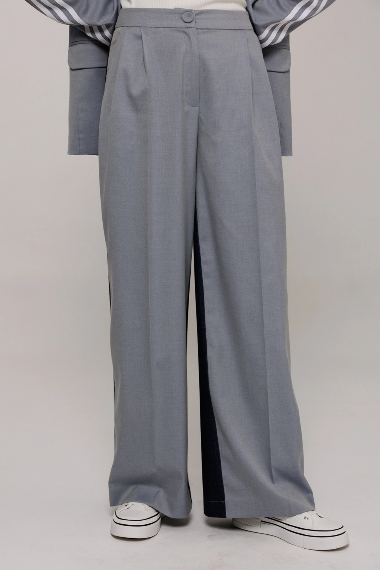 Брюки-палаццо, комбинированные из костюмной ткани по переду и джинса по спинке. Брюки на притачном поясе со шлевками и застежкой-гульфик. Пояс застегивается на петлю-пуговицу. По переду со складками и заутюженной стрелкой от одной из складок по всей длине брюк и карманами в боковых швах с наклонным входом. По спинке кокетка, накладные карманы и заутюженная стрелка.