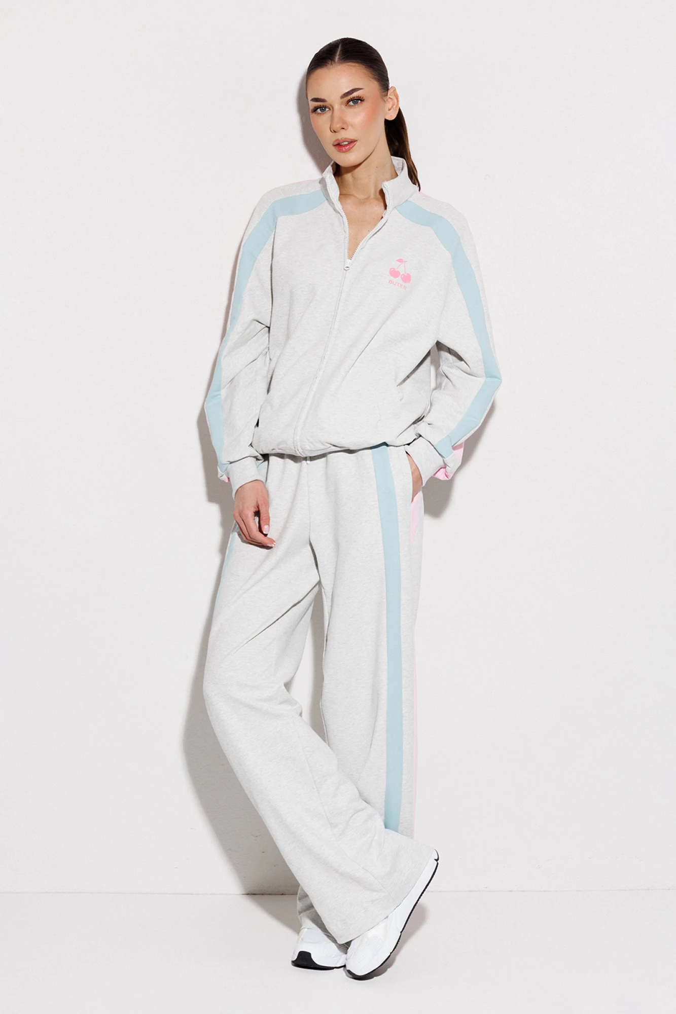 Брюки мультиколор трикотажные (2-хнитка) прямого силуэта на цельнокроеном отстроченном поясе со вставленной в него резинкой и декоративным шнурком. По бокам лампасы из ткани другого цвета и карманом-листочкой от бокового шва.