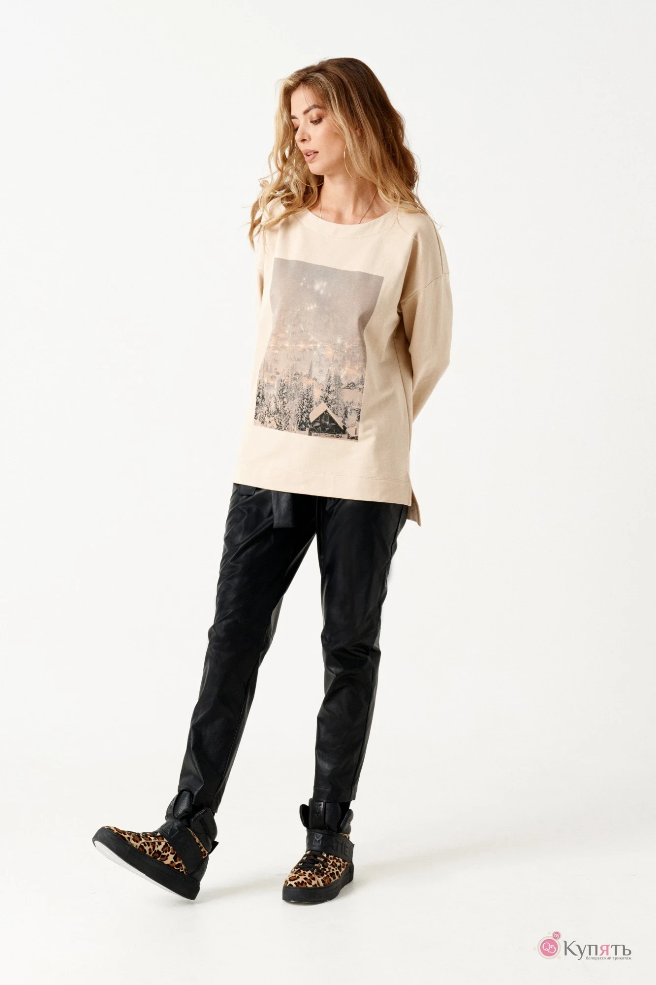 Брюки женские, свободного силуэта, зауженные книзу, из искусственной кожи. По переду брюк складки, выходящие из линии притачивания пояса, застежка на тесьму молнию по типу откосок, гульфик,карманами. Заднее полотнище с вытачками. Верхний срез брюк обработан притачным поясом по переду переходящий в застежку на прорезную петлю, пуговицу, частично на резинке . В комплекте пояс из основной ткани. Низ брюк обработан швом вподгибку с закрытым срезом.
