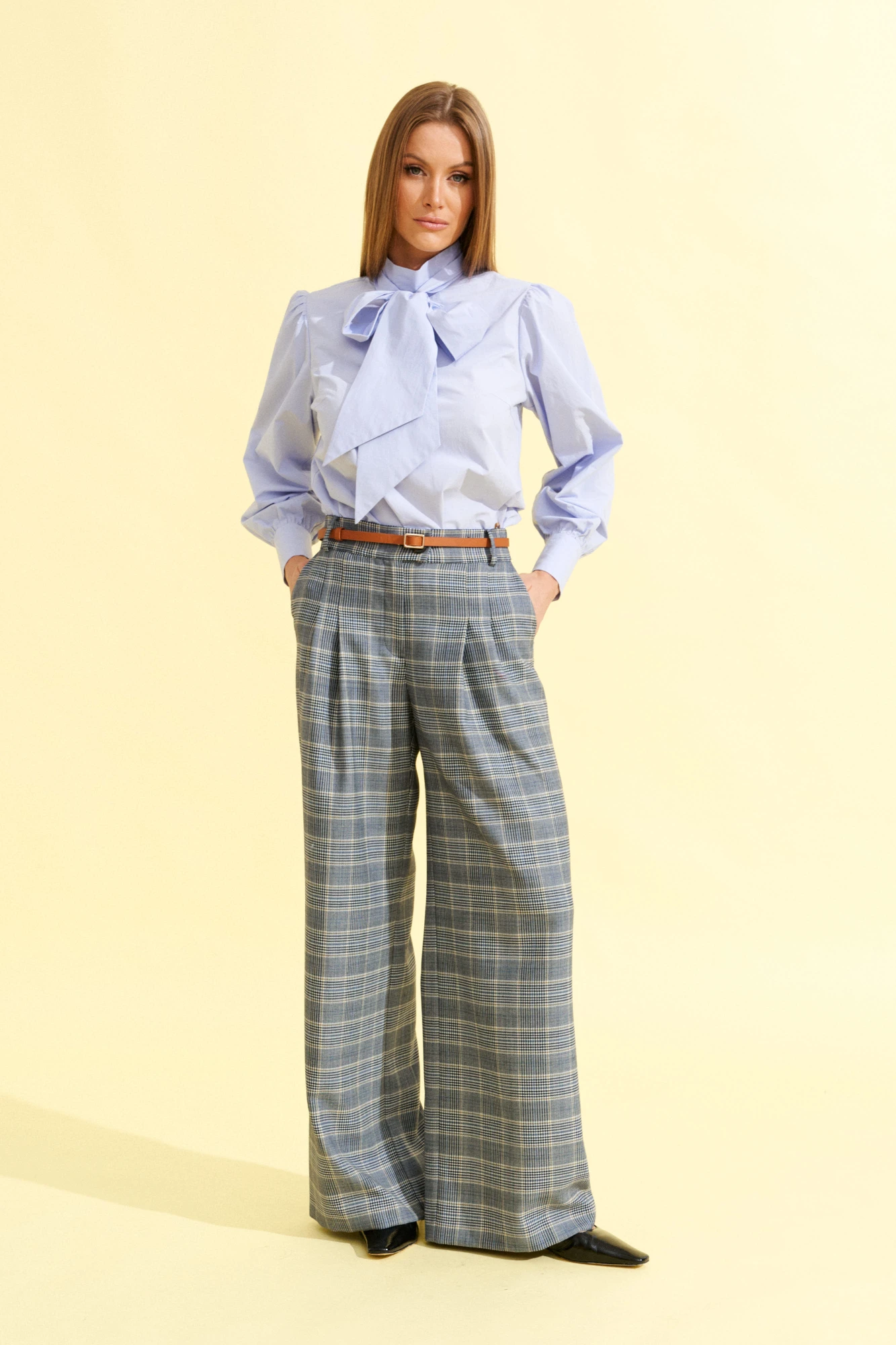 Брюки(палаццо) женские прямые, широкие из костюмной ткани в крупную клетку. Спереди по две застроченные складки, карманы у бокового шва с отрезным бочком и застежка на молнию с гульфиком и откоском. По задним половинкам брюк вытачки. Пояс притачной со шлевками и частично с резинкой, застегивается на пуговицу.