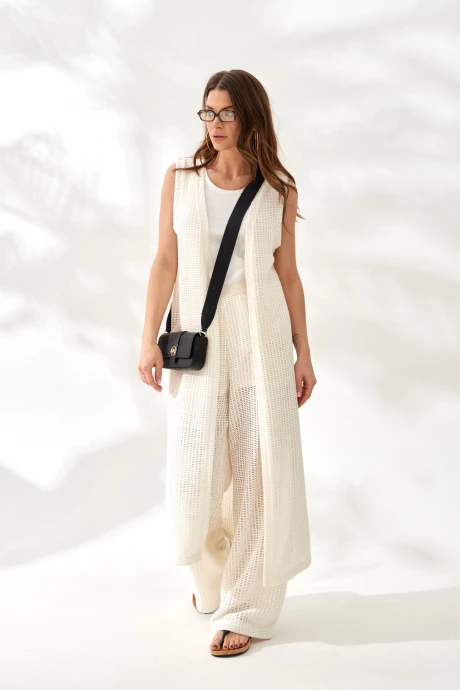 Брюки женские из трикотажного с крупной ячейкой полотна "сетка", прямые широкие длинные, на подкладке из хлопкового тонкого трикотажа в виде коротких шорт. Пояс из декоративной резинки