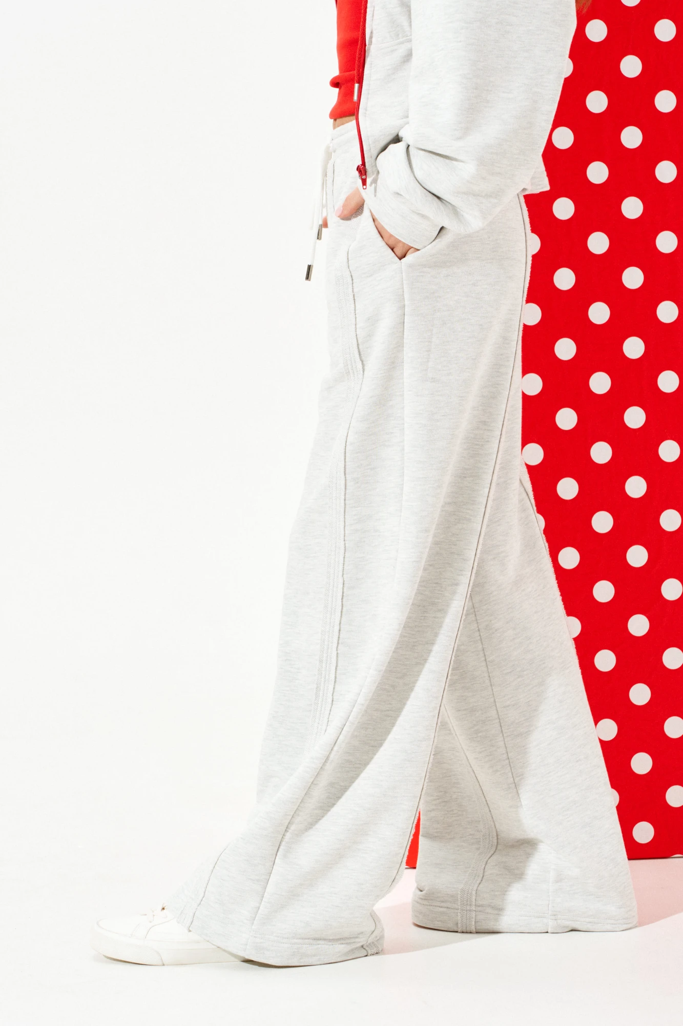Брюки из трикотажного полотна свободного объема, прямого силуэта. Пояс притачной на резинке с отделочными строчками, образующими кулиску, в которую продет декоративный шнур-завязка с наконечниками. Детали переда и спинки с вертикальными швами вразутюжку с необработанными краями. В боковых швах расположены карманы.