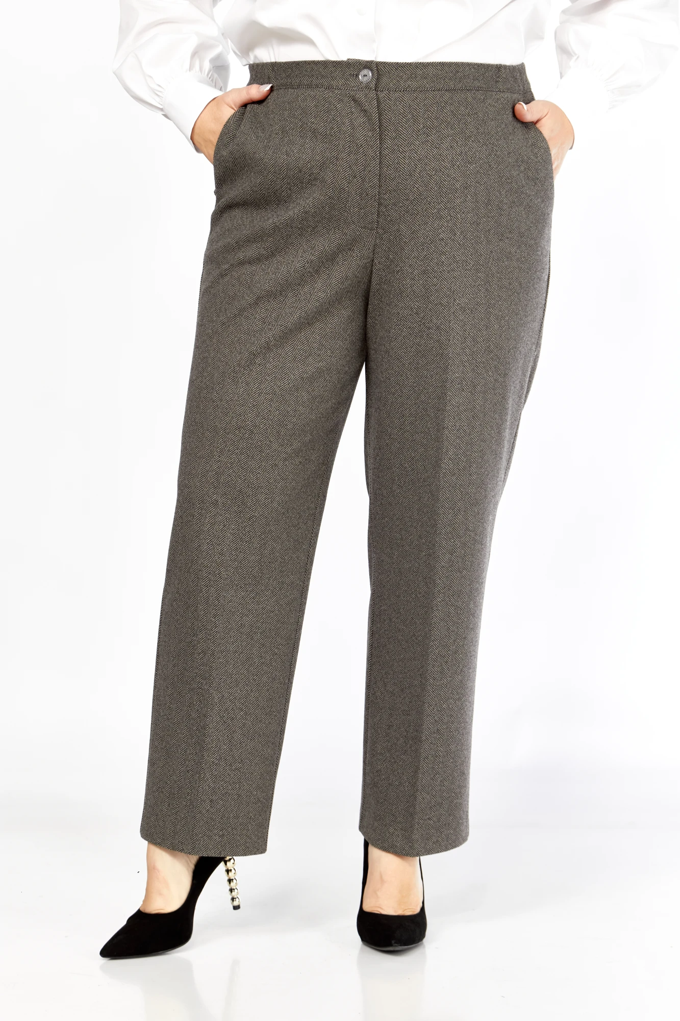 Брюки прямого кроя, спереди обработаны боковые скошенные функциональные карманы. Пояс притачной, частично на резинке, что обеспечивает комфортную посадку. Застежка спереди брюк на молнию и петлю-пуговицу. Ткань обеспечит уют в осеннюю погоду, сохраняя тепло.