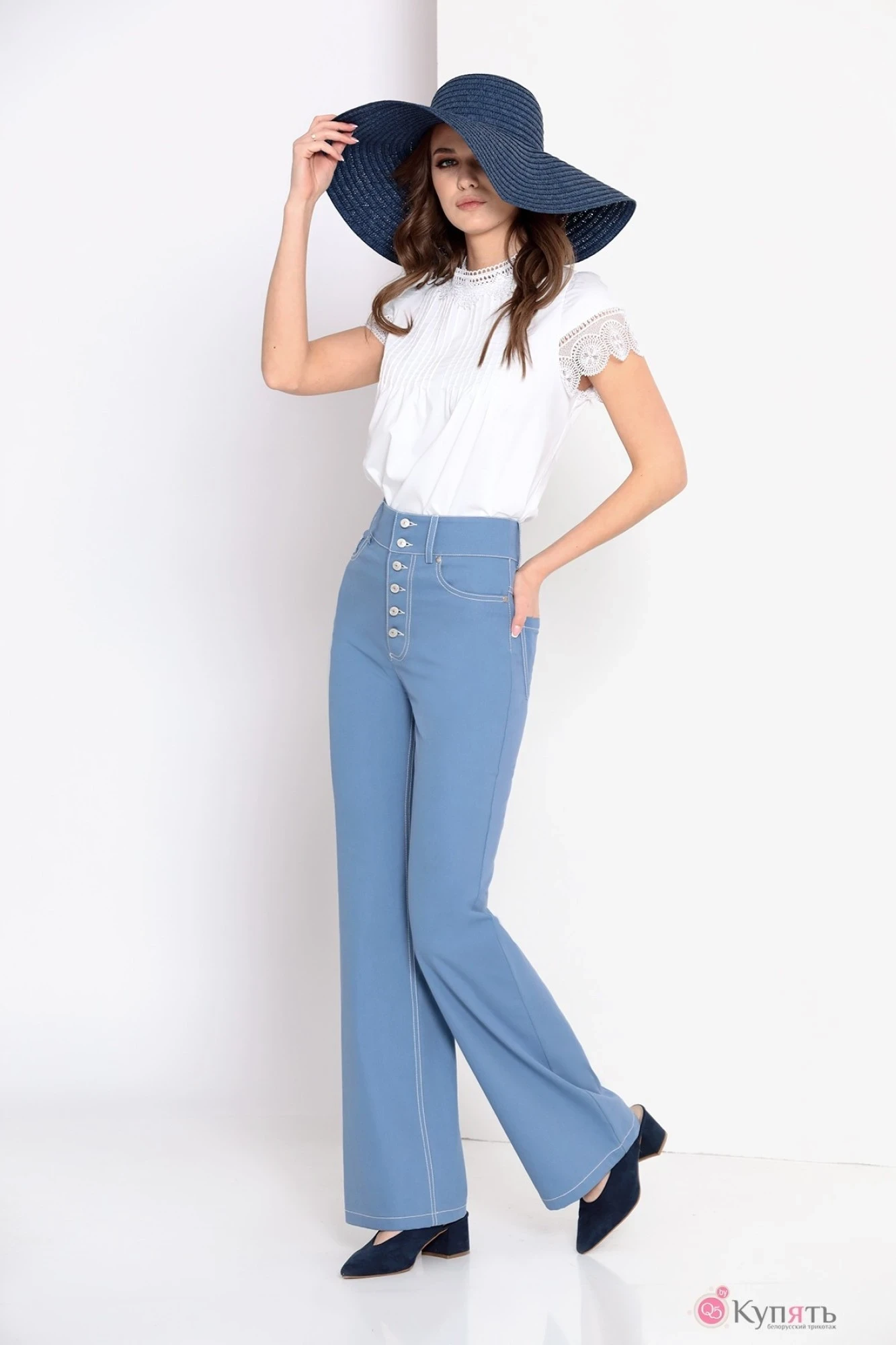 Брюки-клеш выполнены из летнего джинса. Расклешенные. Застежка спереди на пуговицы. Пояс-кокетка со шлевками. Карманы на полочках джинсового типа. Сзади на кокетках принт "creative person". На задних половинках брюк накладные карманы.