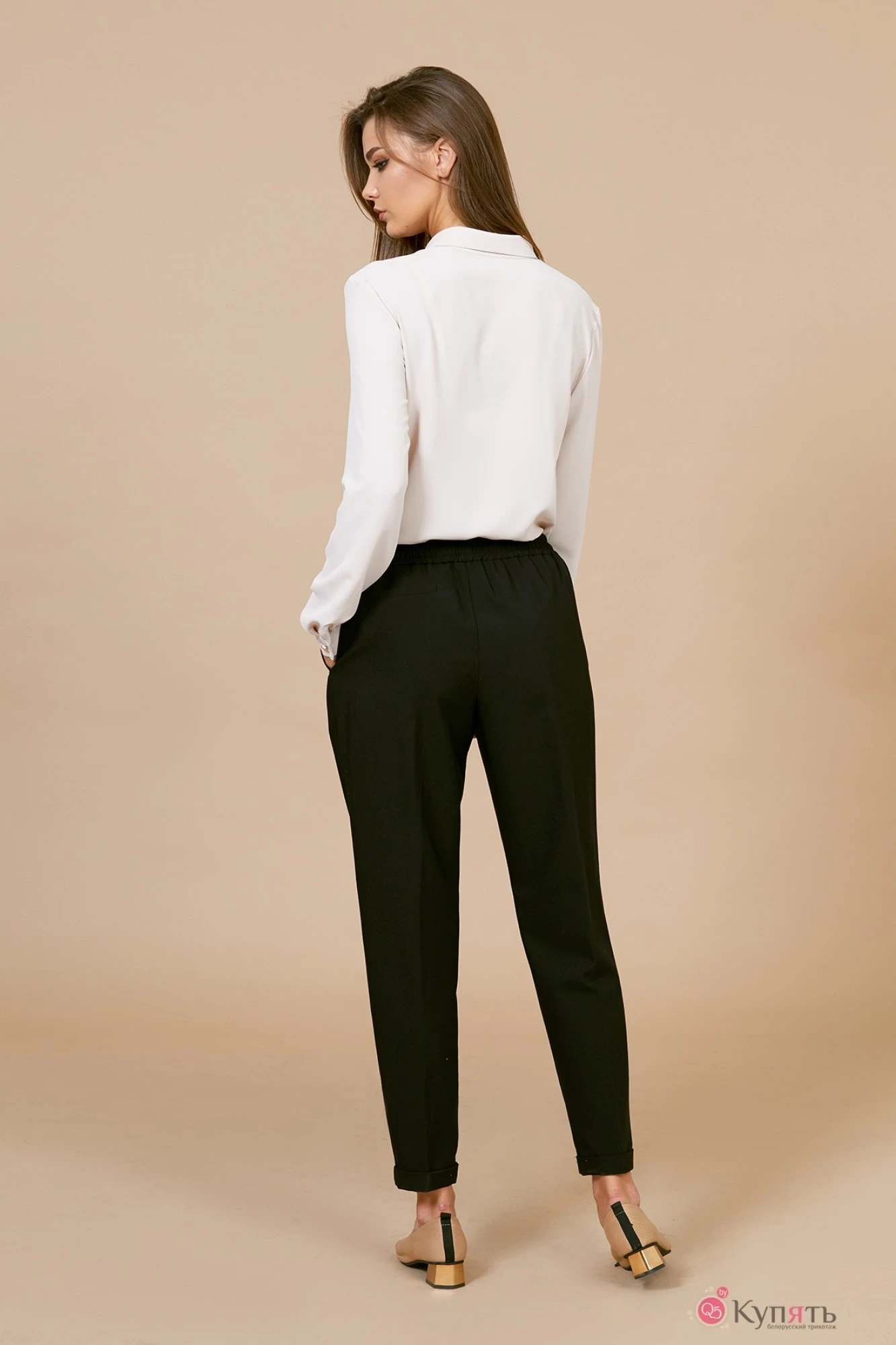 Брюки свободного кроя, заужены книзу, выполнены из однотонной костюмной ткани, карманы по бокам, в пояс вставлена широкая резинка, по низу брюк небольшие отвороты.