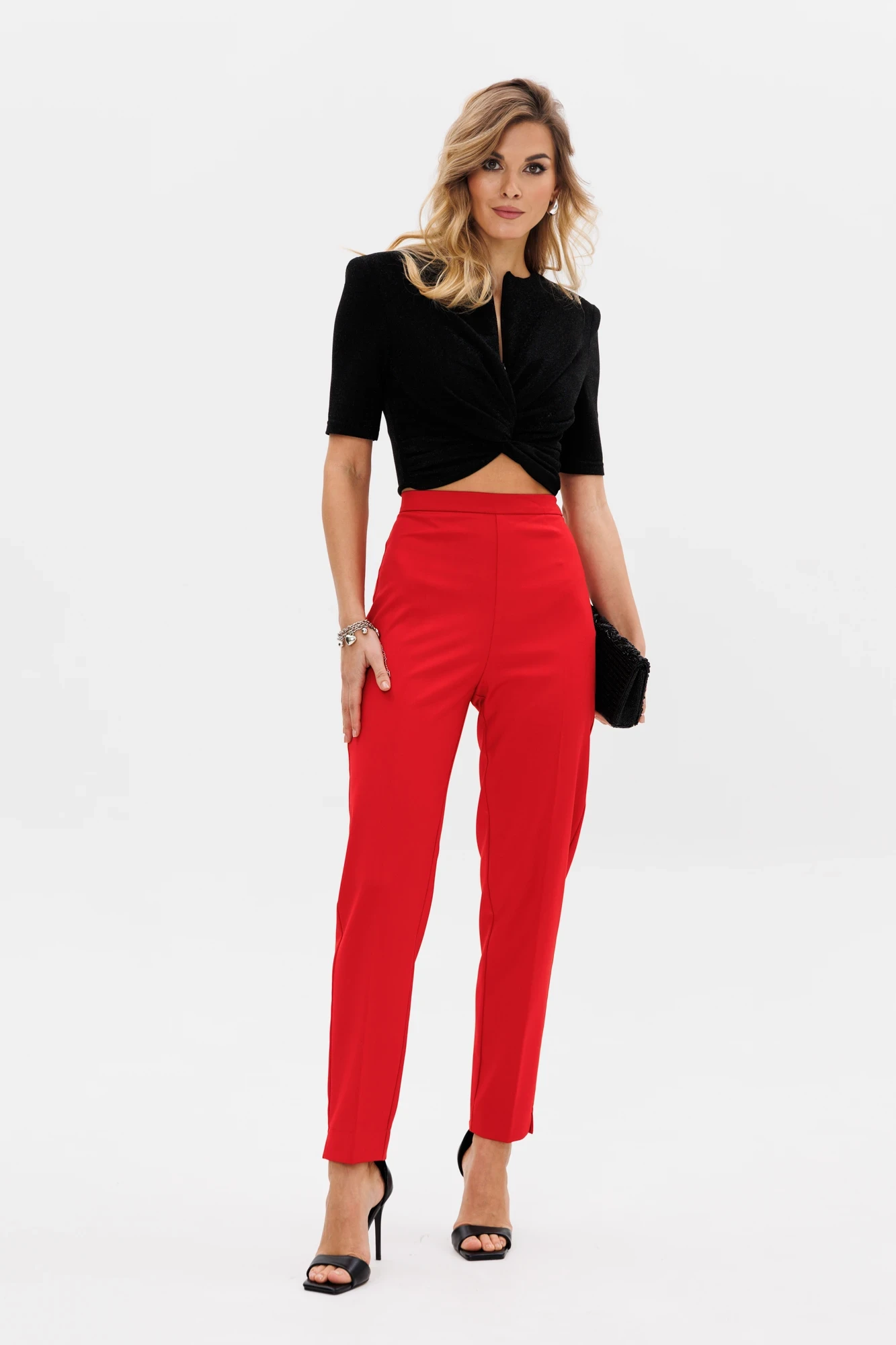 Брюки выполнены из однотонной костюмной ткани, заужены к низу, на задних половинках карманы с листочкой, застежка в боковом шве на металлическую молнию и пуговицу. По низу в боковом шве разрез.