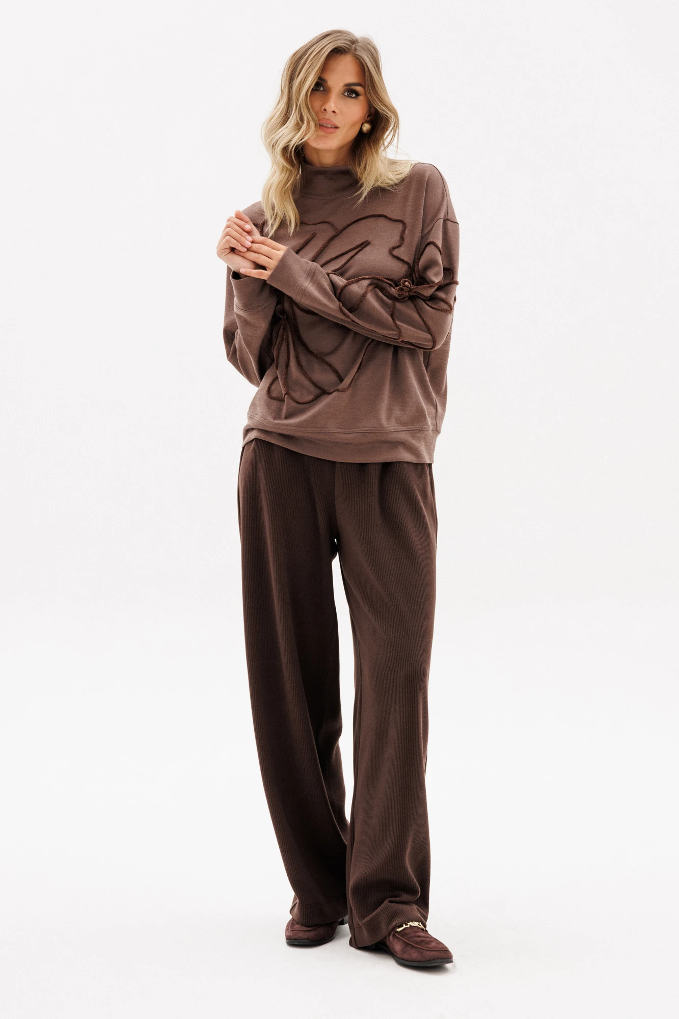 Брюки выполнены из вельвета. Брюки прямого покроя длиной в пол, на притачном поясе с эластичной тесьмой. Спереди боковые карманы с наклонным входом.