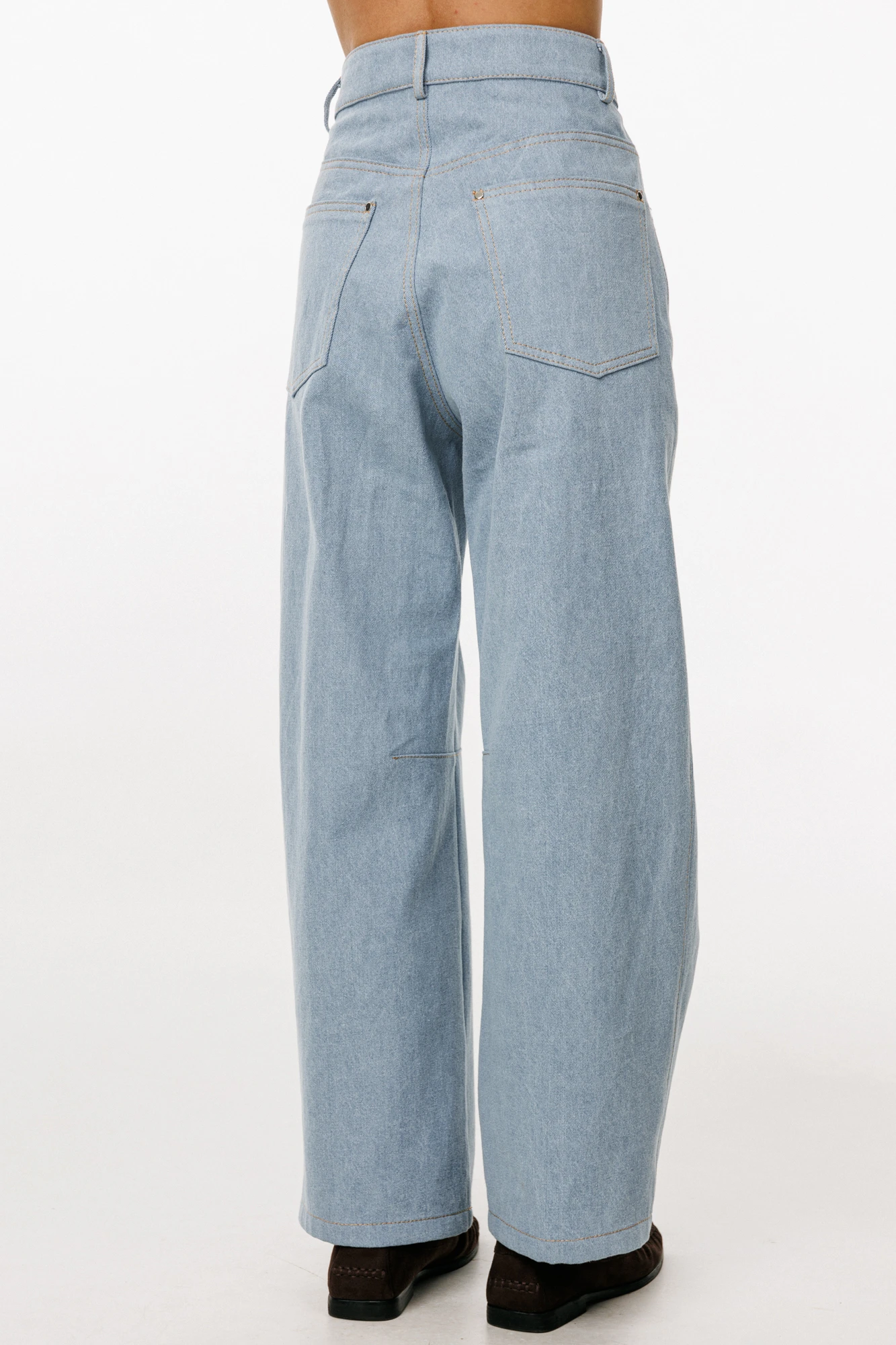 Джинсы-багги выполнены из плотного джинса. Брюки на притачном поясе, длиной до линии щиколотки, расширенные от бедер и слегка зауженные к низу. Спереди боковые карманы с фигурным входом. Застежка на пуговицу и молнию с гульфиком. На задних частях кокетки и накладные карманы. На передней и задней части коленные вытачки.