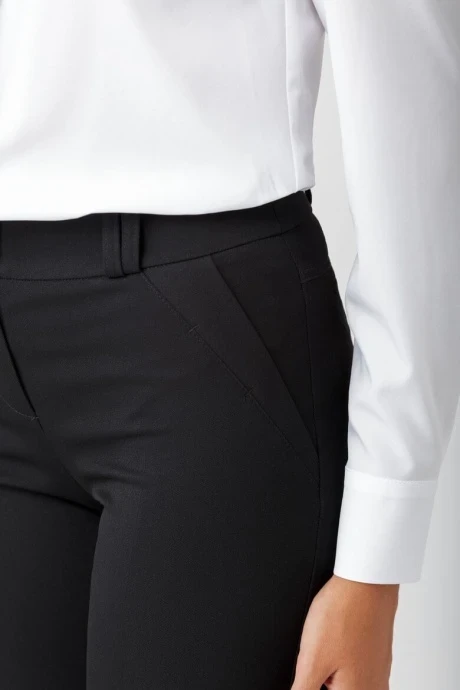 Прямые классические брюки со стрелками. Притачной пояс со шлевками. Средняя посадка на талии. Застежка на молнию и две пуговицы.