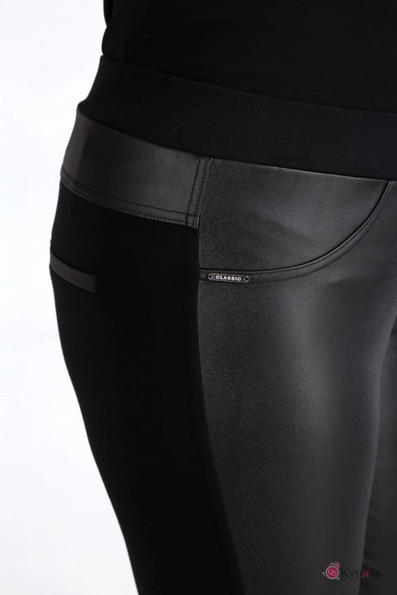 Брюки – легинсы, комбинированные из двух видов ткани. Передние детали изготовлены из эко кожи, на которых имеются фигурные подрезы, имитирующие боковые карманы. Задние детали брюк на кокетке, изготовлены из плотного трикотажного полотна с имитацией карманов с листочкой. Брюки средней посадки с притачным поясом на резинке. В качестве отделки логотип.