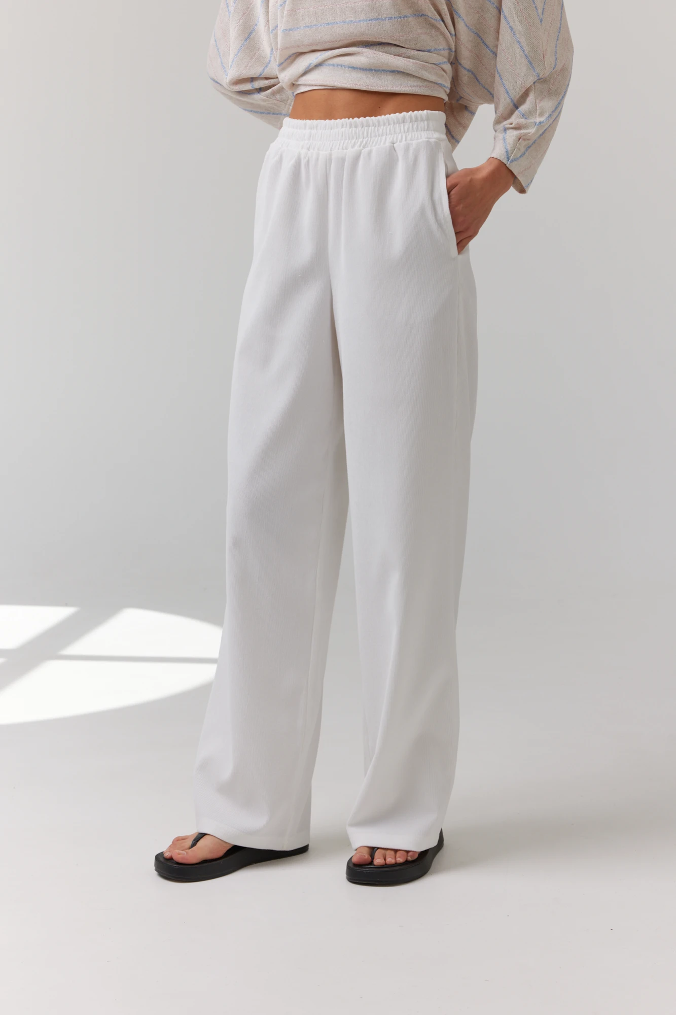 Брюки женские, расширенные. По переду обработаны карманы с наклонным входом. На задних половинках брюк застрочены вытачки. Верх обработан широким притачным поясом с резинкой. Цвет материала может отличаться по тону в зависимости от настроек вашего монитора!