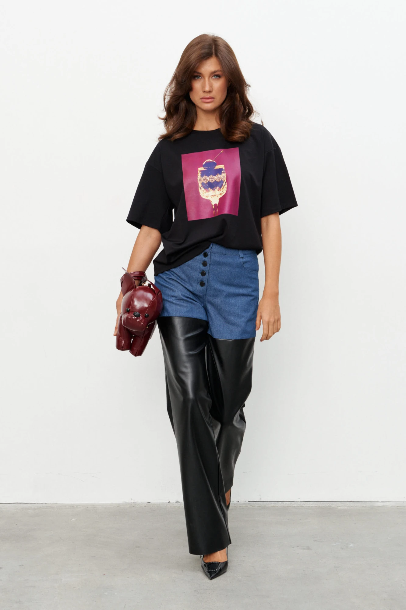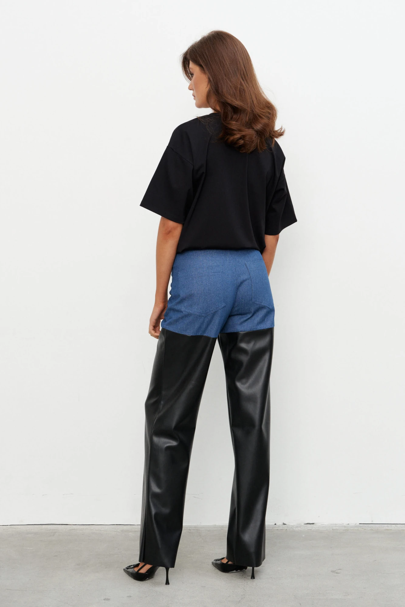 Брюки прямого силуэта выполнены на сочетании плотного джинса и экокожи. Брюки на поясе со шлёвками и застежкой на металлические пуговицы-болты. По переду два прорезных кармана, по спинке - два накладных.