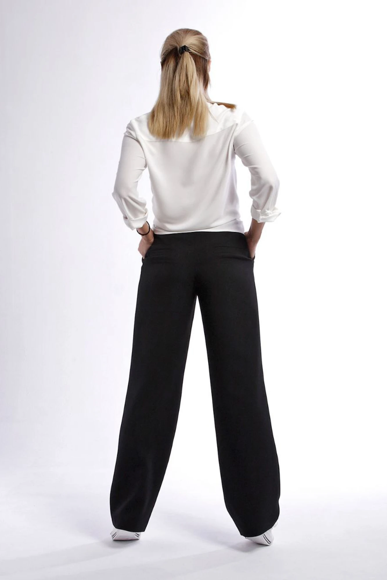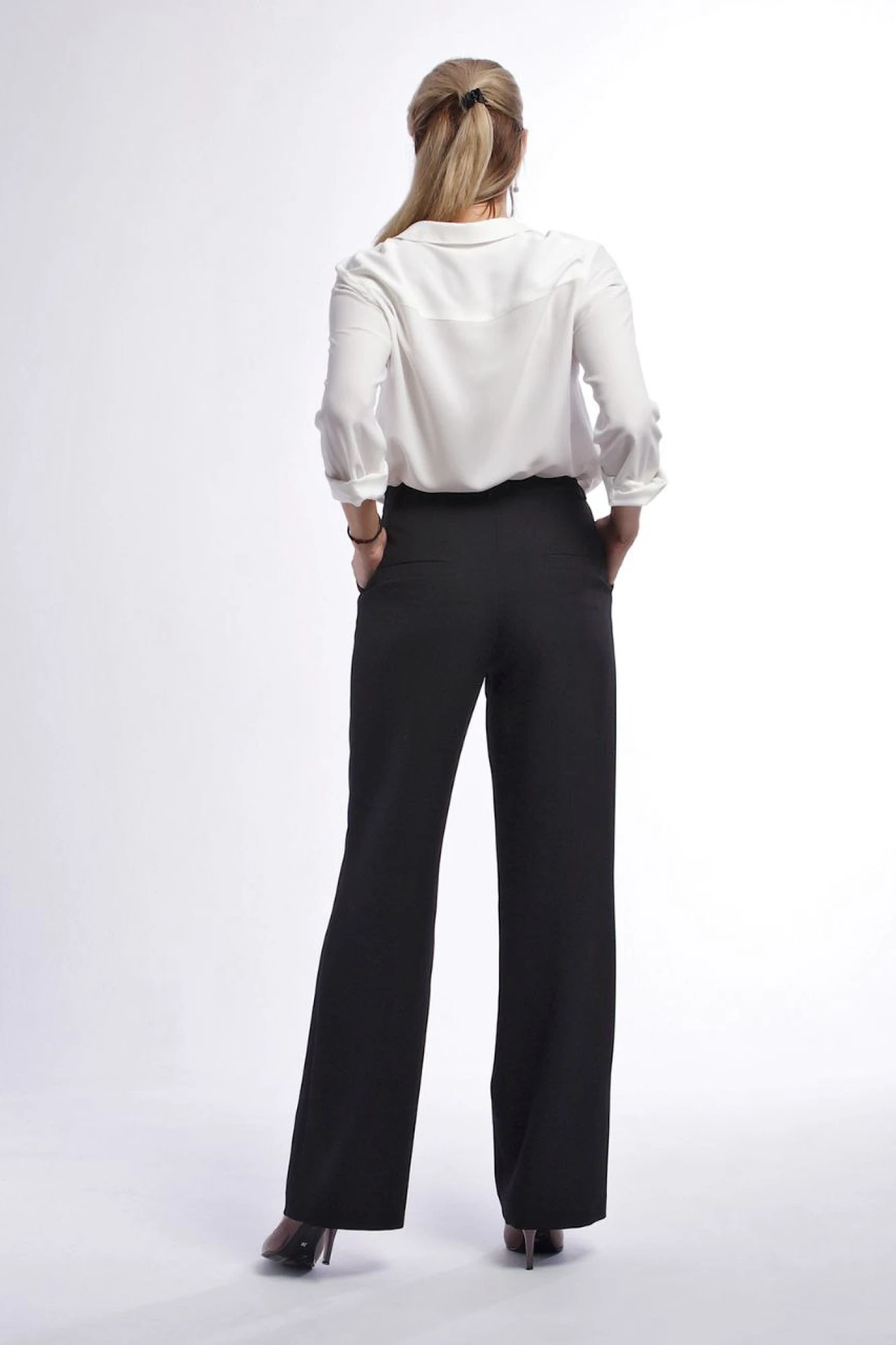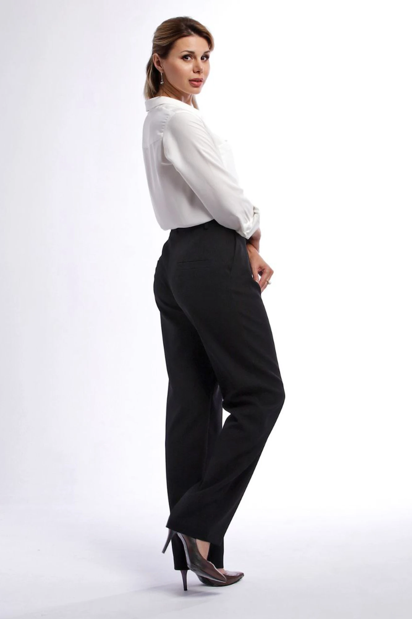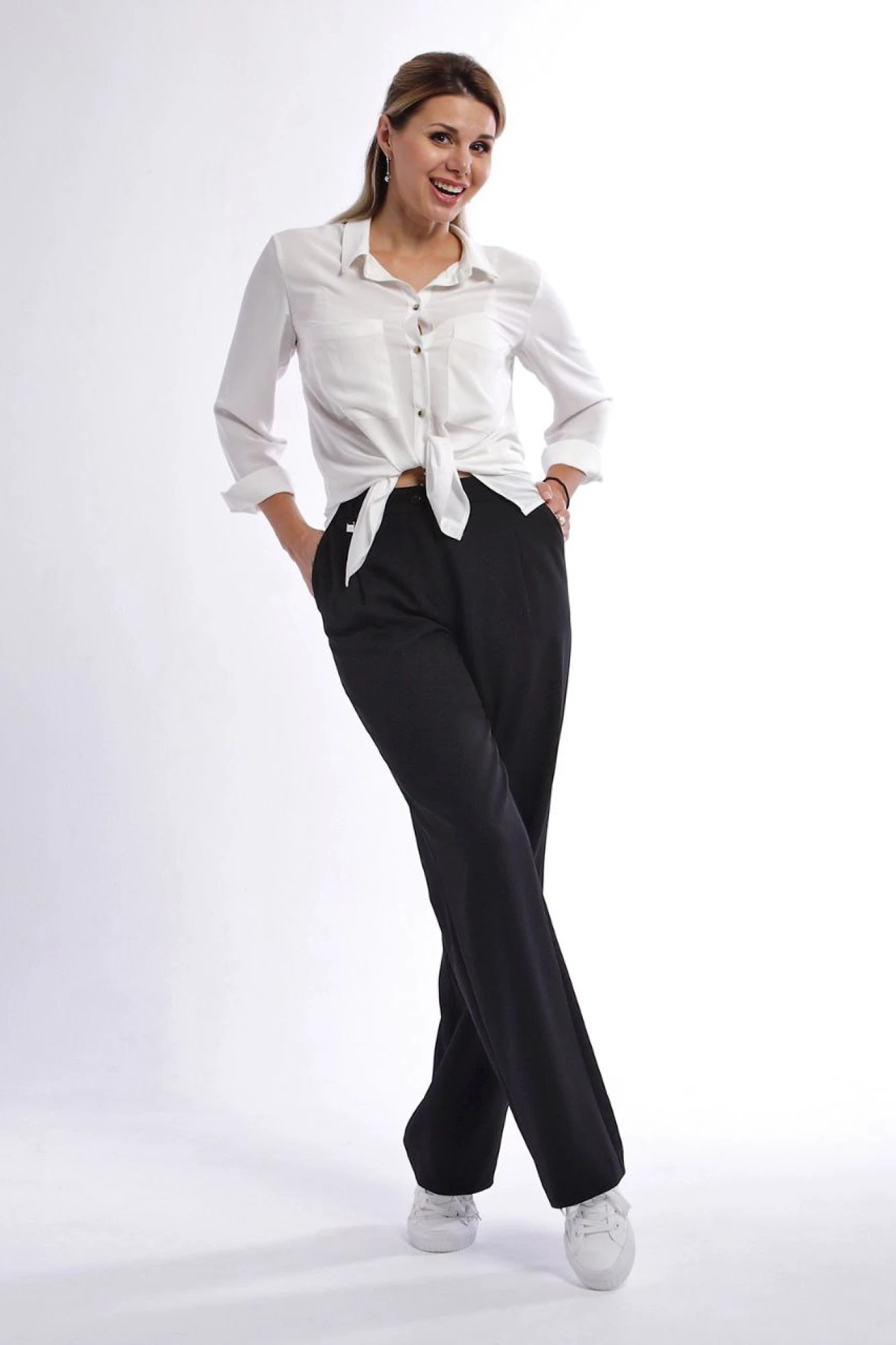 Брюки женские свободного кроя с высокой посадкой. Спереди по линии талии выполнены неглубокие складки. На передних частях выполнены карманы с отрезными бочками. Застежка петля, пуговица, молния. По спинке талиевые вытачки и прорезной карман-имитация с планками. Длина шагового шва 81 см. Ткань - текстиль с добавлением лайкры, хорошо тянется, малосминаемая, не деформируется после стирки.
