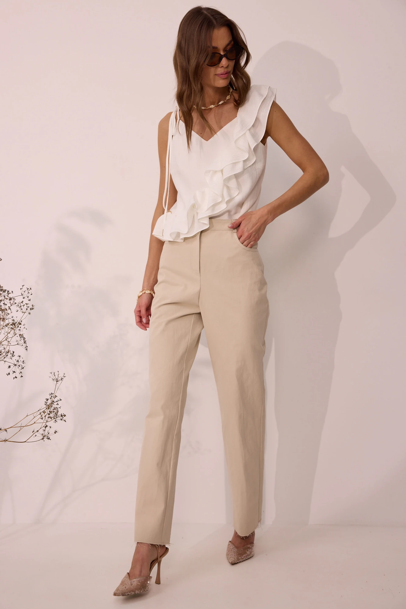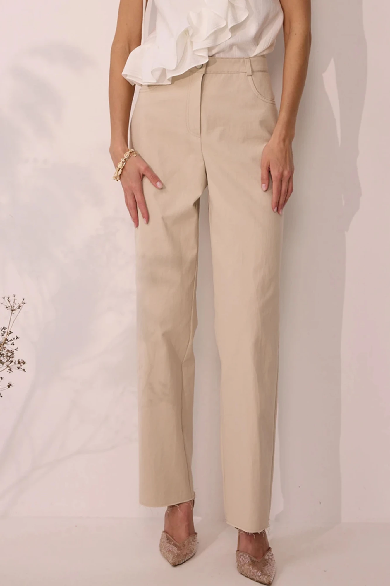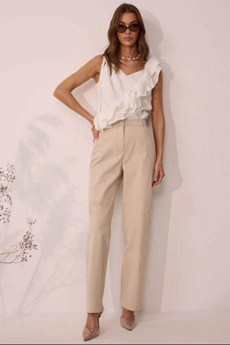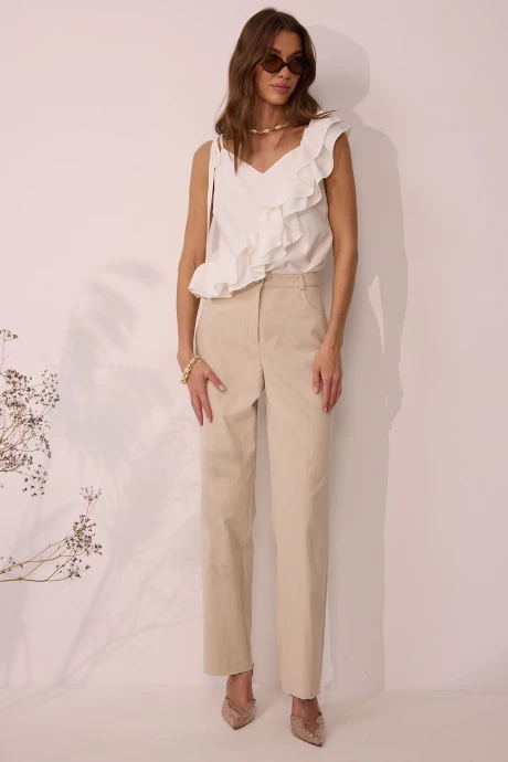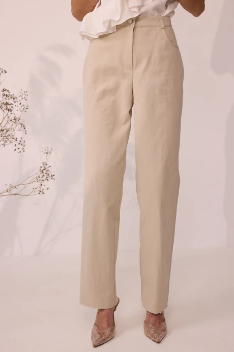 Брюки прямого силуэта из хлопковой ткани. По верху брюк притачной пояс с застежкой на петлю и пуговицу и шлевками для ремня. На передних половинках обработаны карманы и застежка молния в среднем шве. На задних - кокетка и карманы. Низ брюк без обработки.