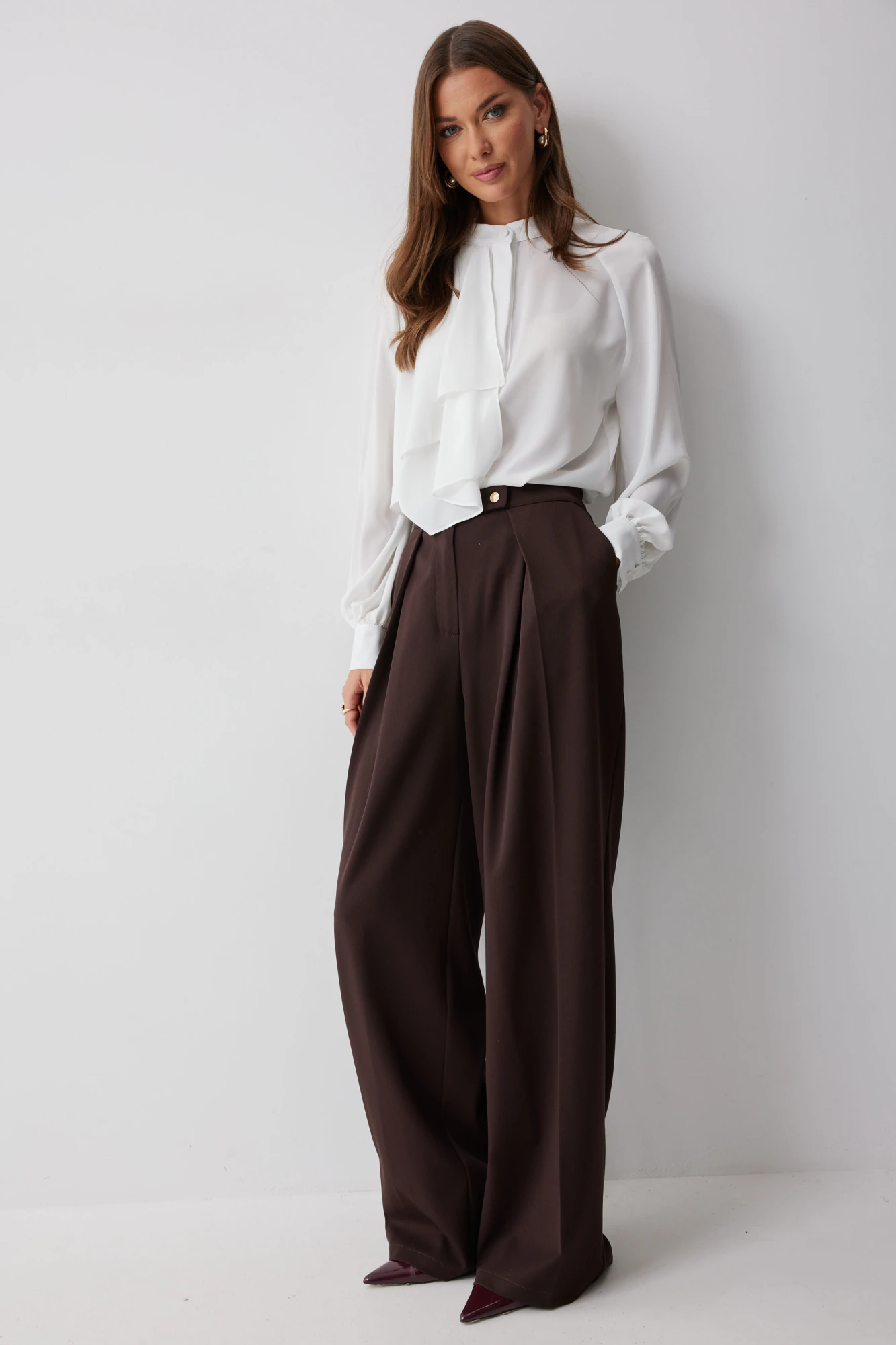 Брюки прямого силуэта расширенные книзу из костюмной ткани. По верху брюк притачной пояс с застежкой на петли и пуговицы. На передних половинках обработана застежка молния в среднем шве. На передних половинках карманы и декоративные складки. По поясу задних половинок брюк резинка и вытачки. Обращаем ваше внимание, что фурнитура может отличаться от фото.