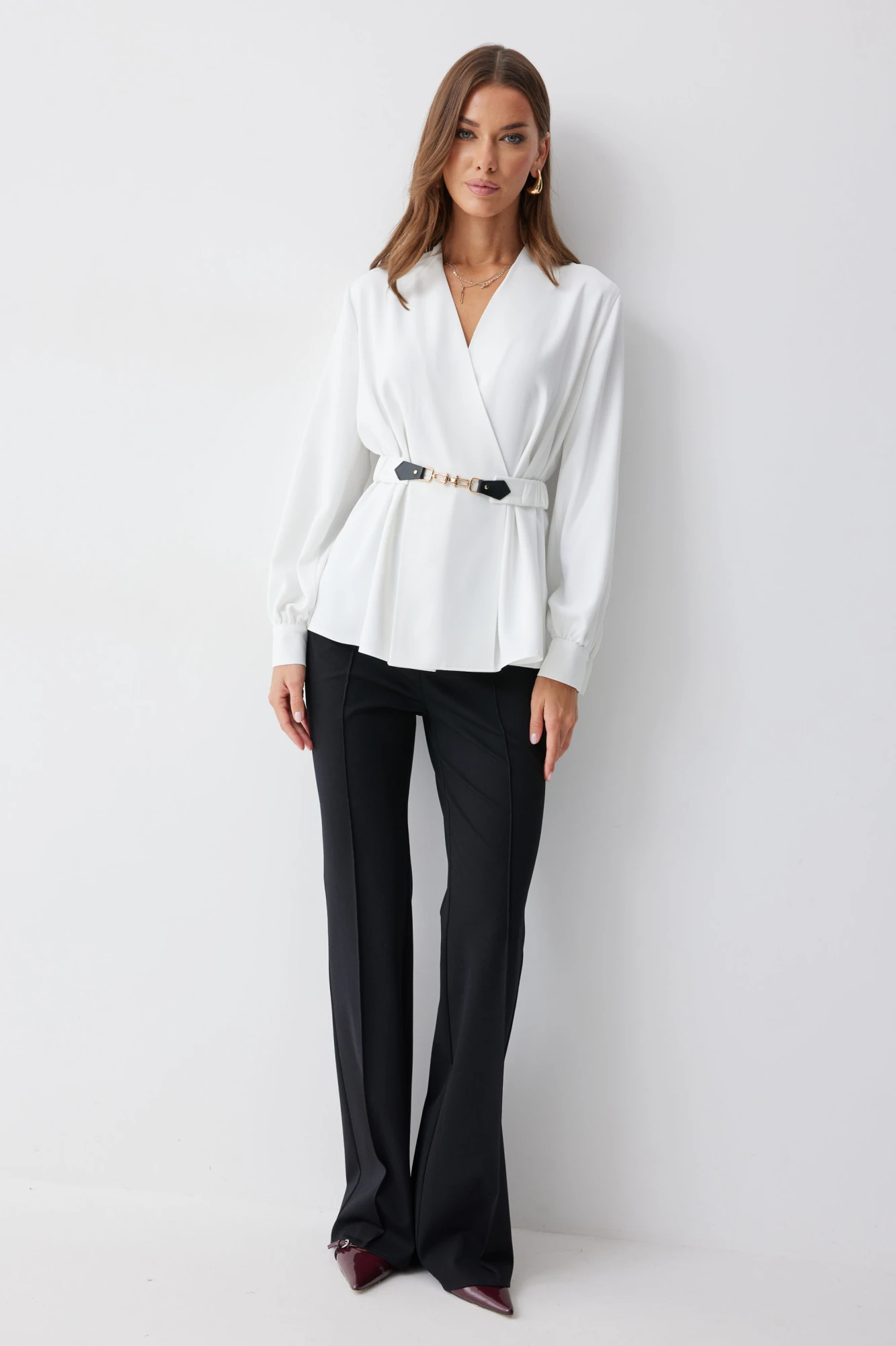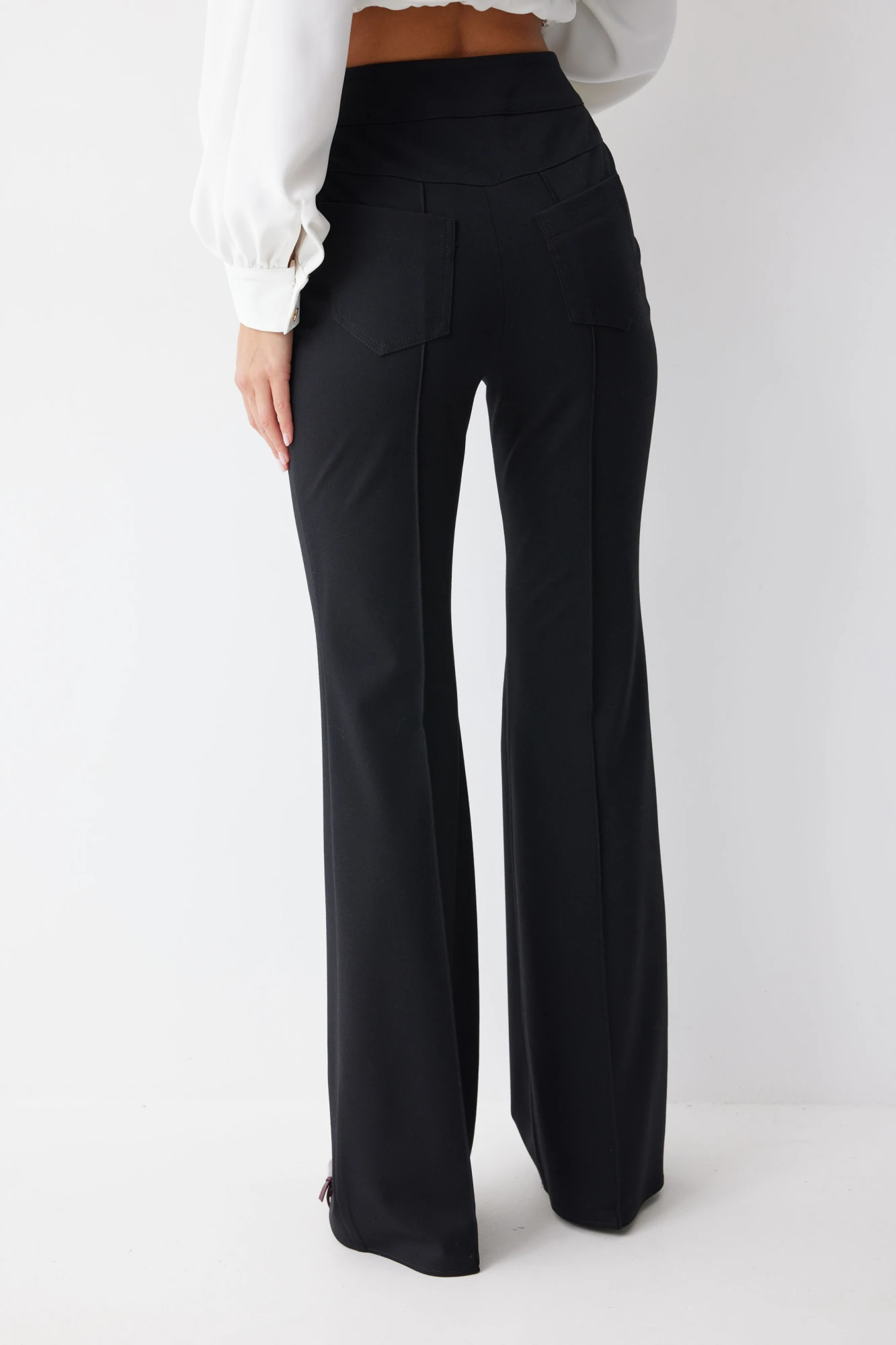 Брюки прямого силуэта с защипами из трикотажного полотна. По верху брюк притачной пояс и центральная застежка на петли и пуговицы. На передних половинках защипы и декоративные листочки. На задних половинках брюк накладные карманы. Обращаем ваше внимание, что фурнитура может отличаться от фото.