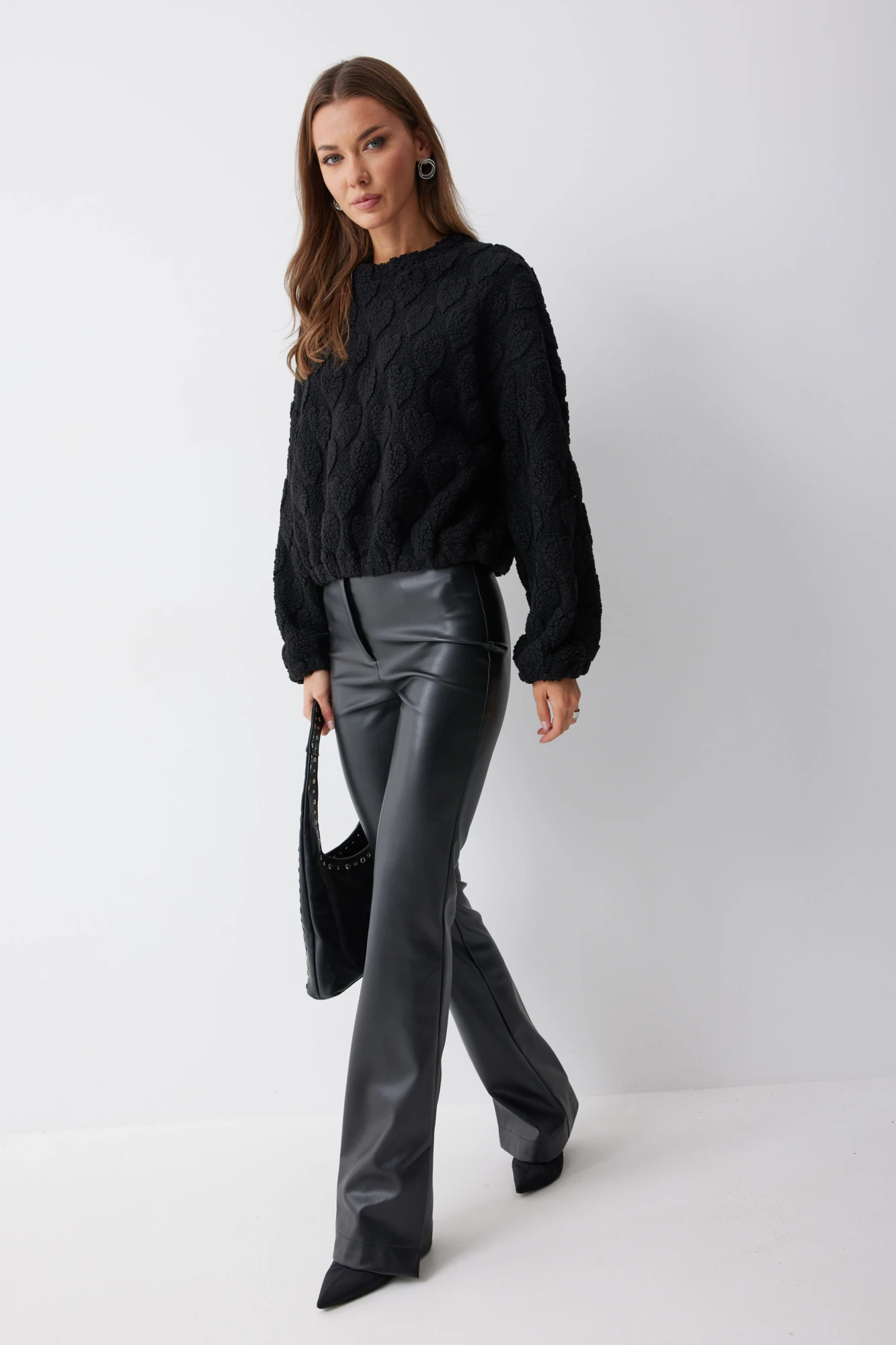 Брюки прилегающего силуэта расширенные книзу из экокожи. По верху притачной пояс с застежкой на петлю и пуговицу. На передних половинках обработана застежка молния в среднем шве. По низу брюк в боковом шве шлица.Обращаем ваше внимание, что фурнитура может отличаться от фото.