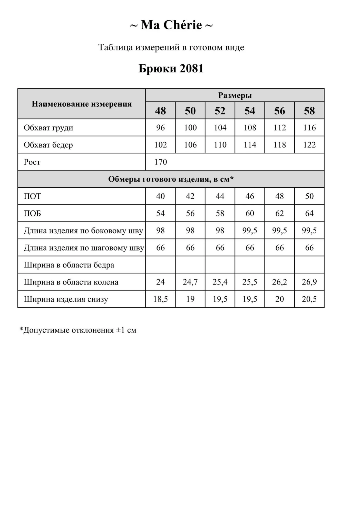 Таблица размеров