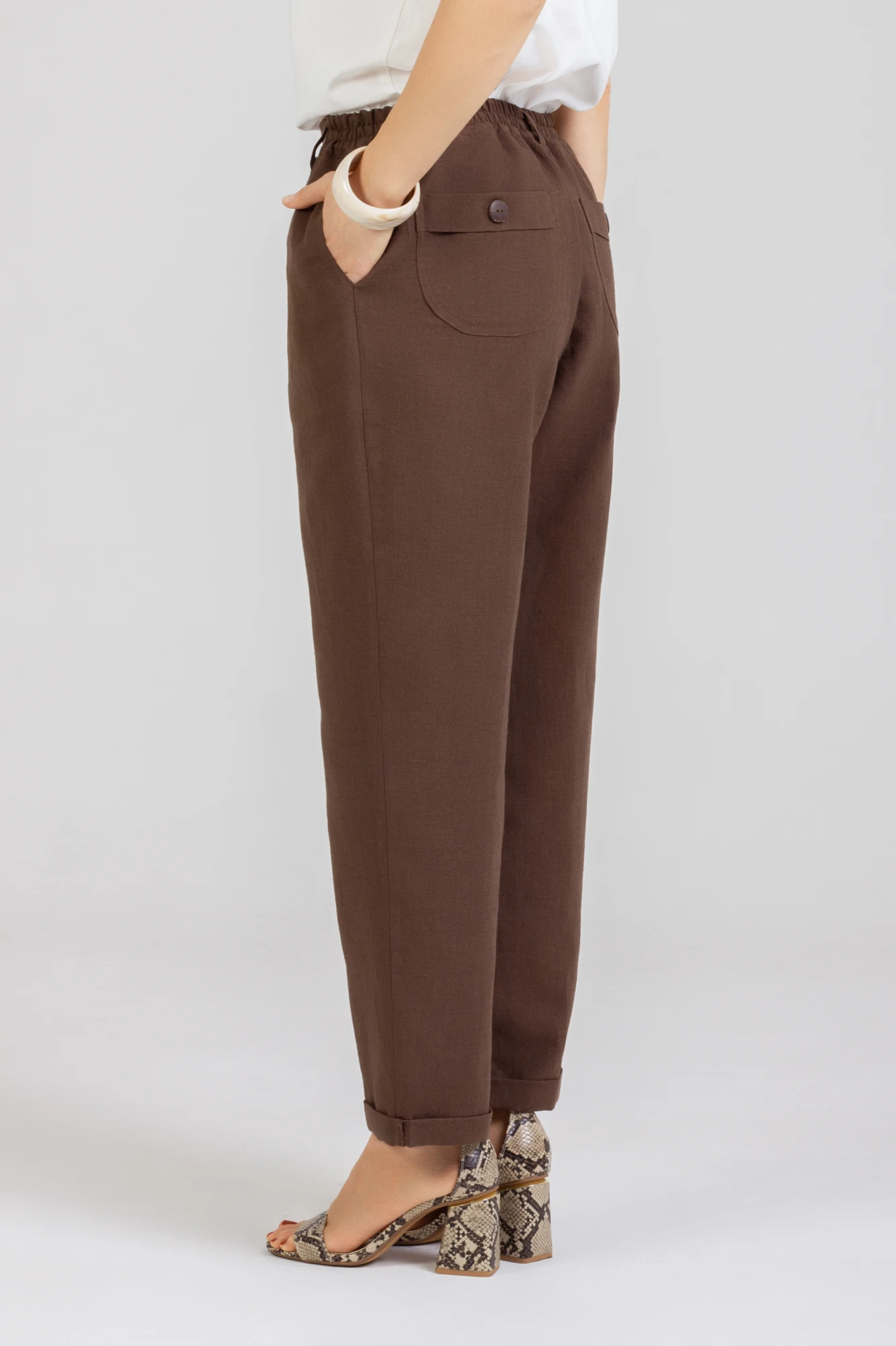 Стильные Брюки -Бананы изготовлены из качественного льна с эффектом мятости. Брюки летнего ассортимента, свободные ,застёгиваются на молнию.По переду внутренние карманы. Сзади накладные карманы. Очень удобные. Отворот не закреплён. Подходят как на рост 164, так и на рост 170. Застёгиваются на молнию и 2 пуговицы. В задней части пояса и частично по переду вставлена резинка. Посадка: средняяДлина брюк по боковому шву с поясом 100-103 см . Длина пояса ( резинка в растянутом виде): 46 р.-82 см, 48 р.-86 см, 50 р.-91 см, 52 р-95 см, 54 р-100 см. Хорошо сочетаются в комплекте с м 1293 Туника- белый лён, 1181 Блузон-шоколад.