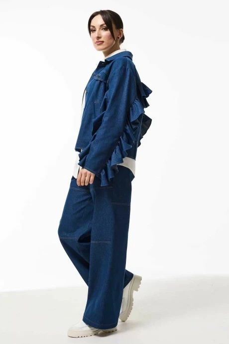 Брюки слегка зауженные к низу, с центральной застежкой на тесьму-молнию и пуговицы. Перед с боковыми карманамии двумя горизонтальными подрезами. Спинка с накладными карманами и одним горизонтальным подрезом выше колена.