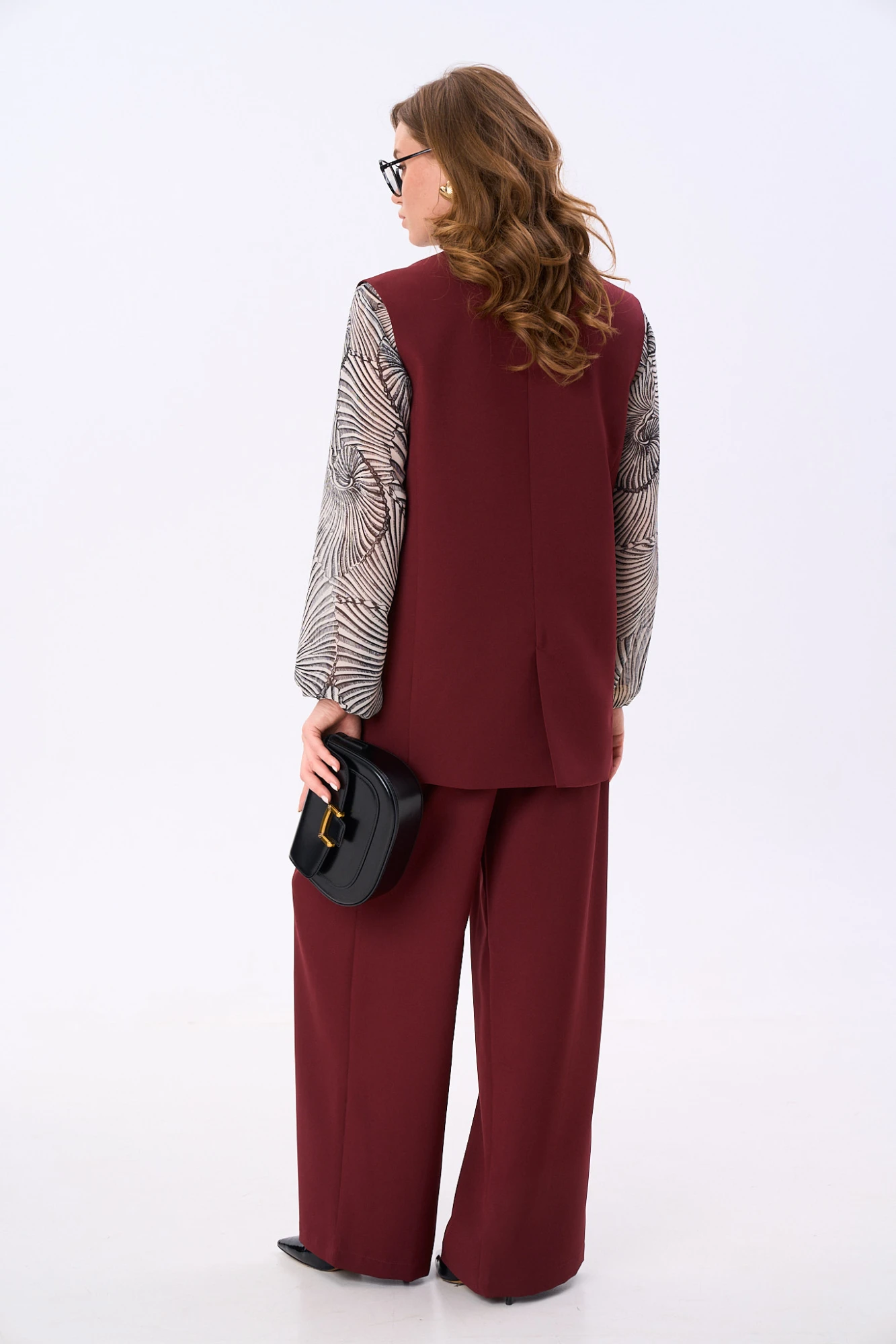 Элегантные брюки прямого кроя с боковыми карманами с отрезным бочком. Застежка на молнию и пуговицу. По переду - складки. Задние половинки с талиевыми вытачками и прорезными карманами с листочкой. Верхний срез обработан притачным поясом, по спинке собран на резинку. Низ обработан швом в подгибку.