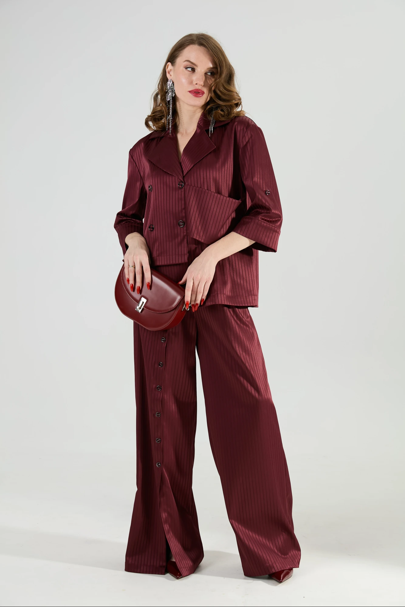 Брюки свободного кроя, верхний срез представлен широкой резинкой, с карманами. По центру правой брючины расположена планка с функционирующими петлями и пуговицами.