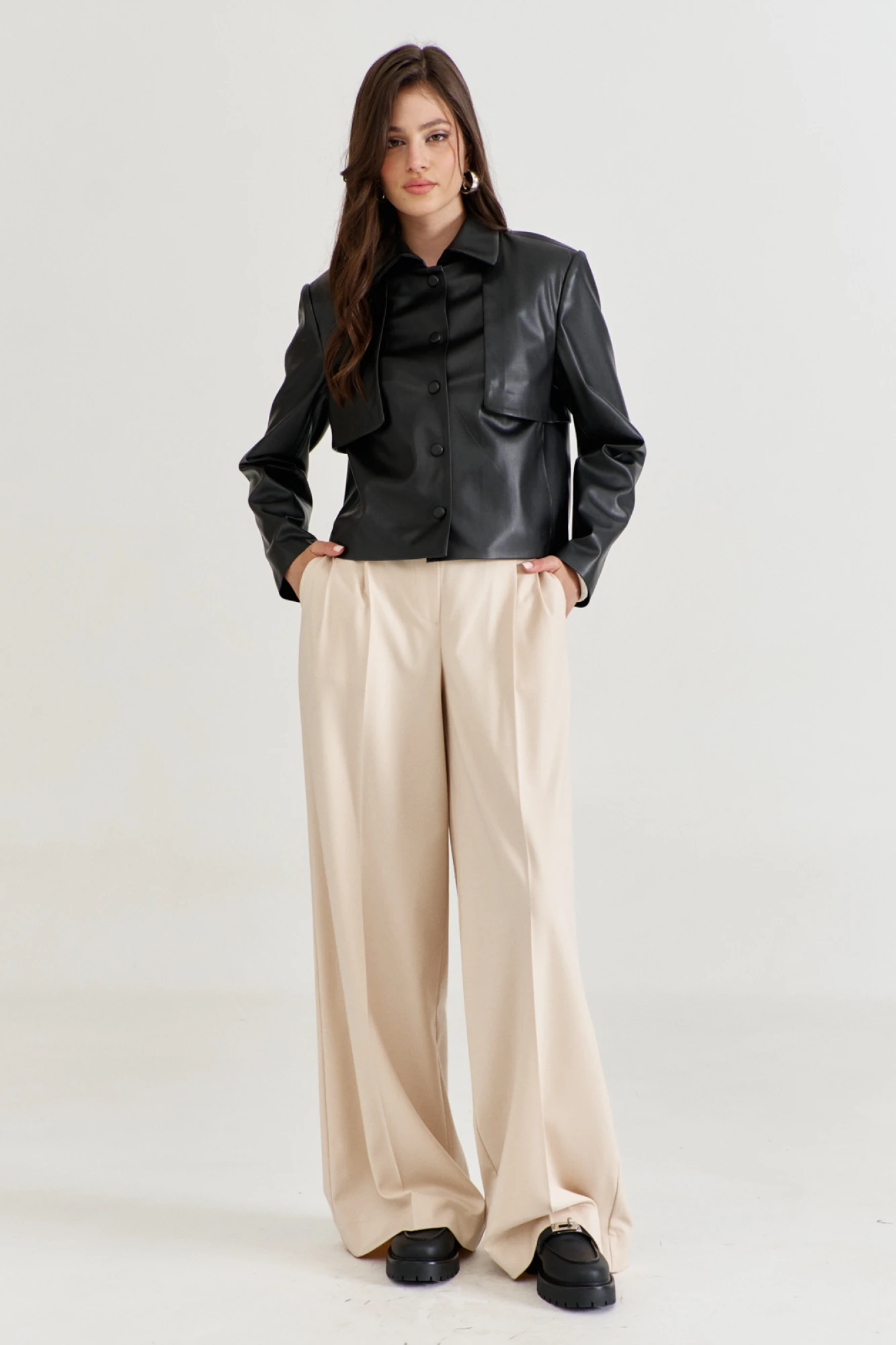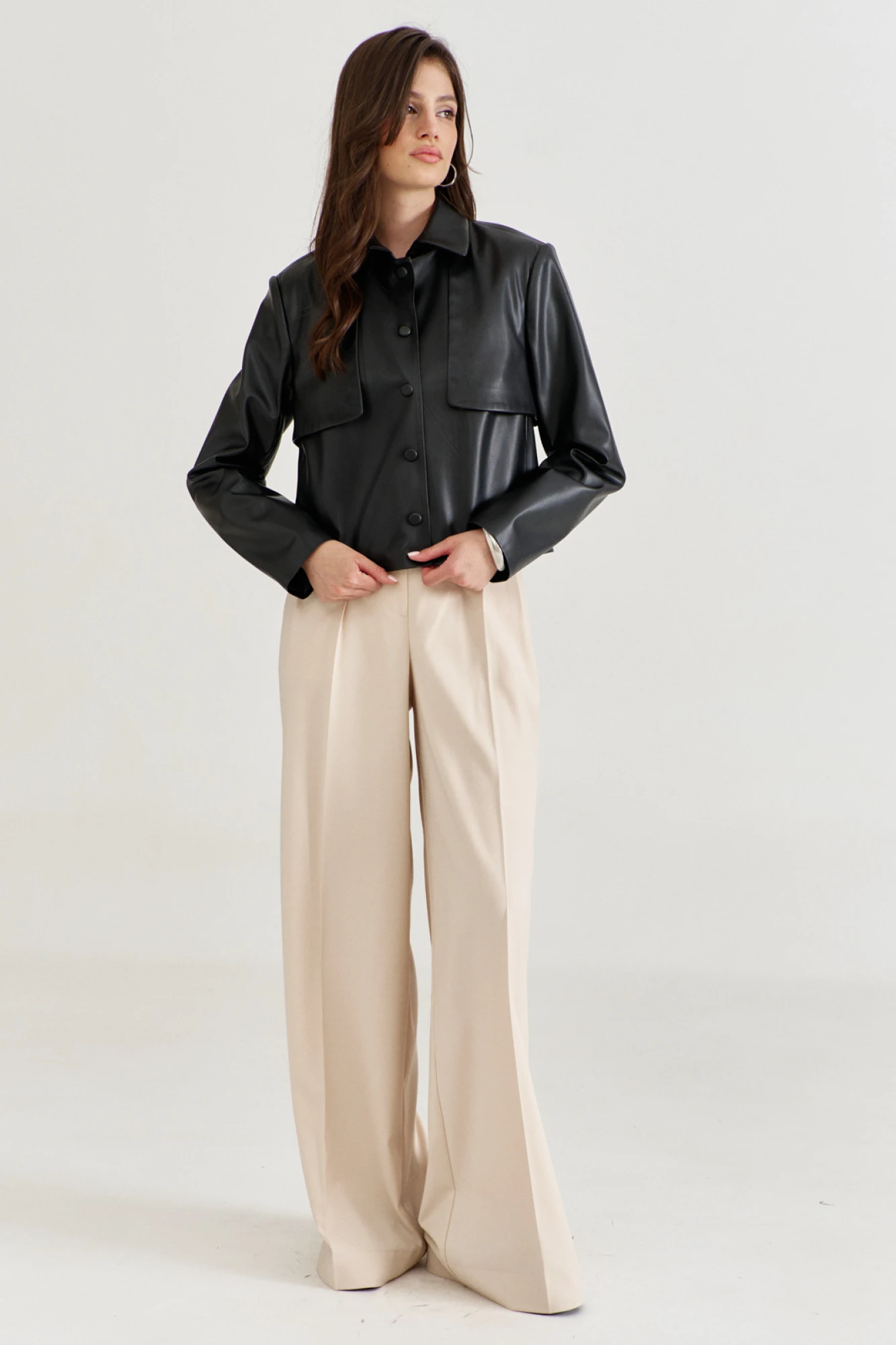 Брюки женские, длинные. По задним половинам талиевые вытачки и цельнокроеный пояс. По передним половинам односторонние складки частично застроченные, карманы фигурной формы. По задним и передним половинам заутюжены стрелки. В среднем шве обработана застежка на тесьму-«молнию». Верхний срез передних половин обработан притачным поясом. По спинке, между вытачками вставлена резинка.