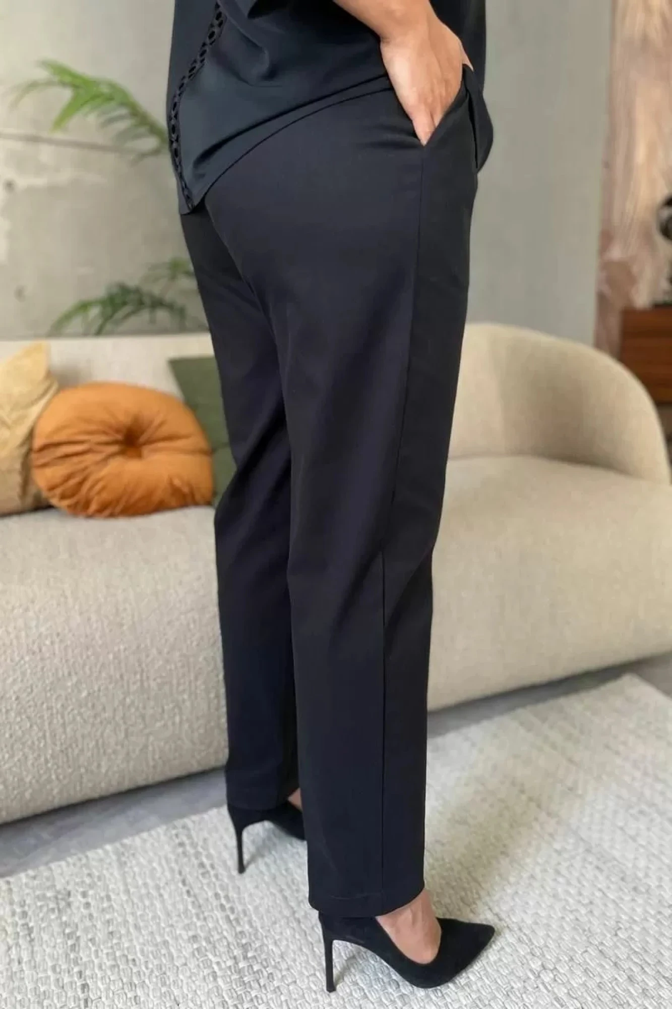 Брюки женские из джинсовой ткани,полуприлегающего силуэта, слегка заужены к низу. По переду брюк расположена складка и карман. Пояс притачной, по задней части резинка. Застежка брюк на петлю-пуговицу.