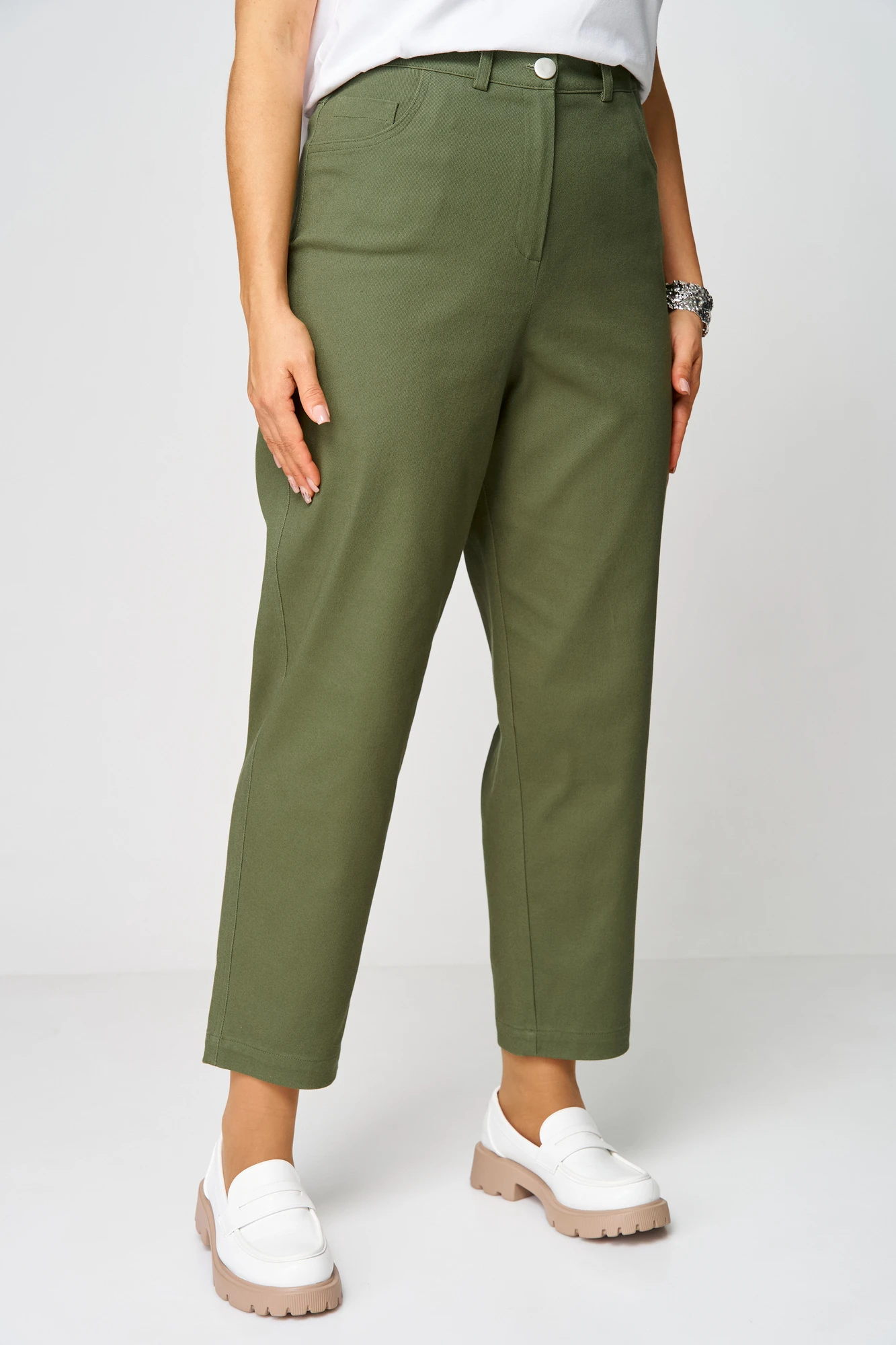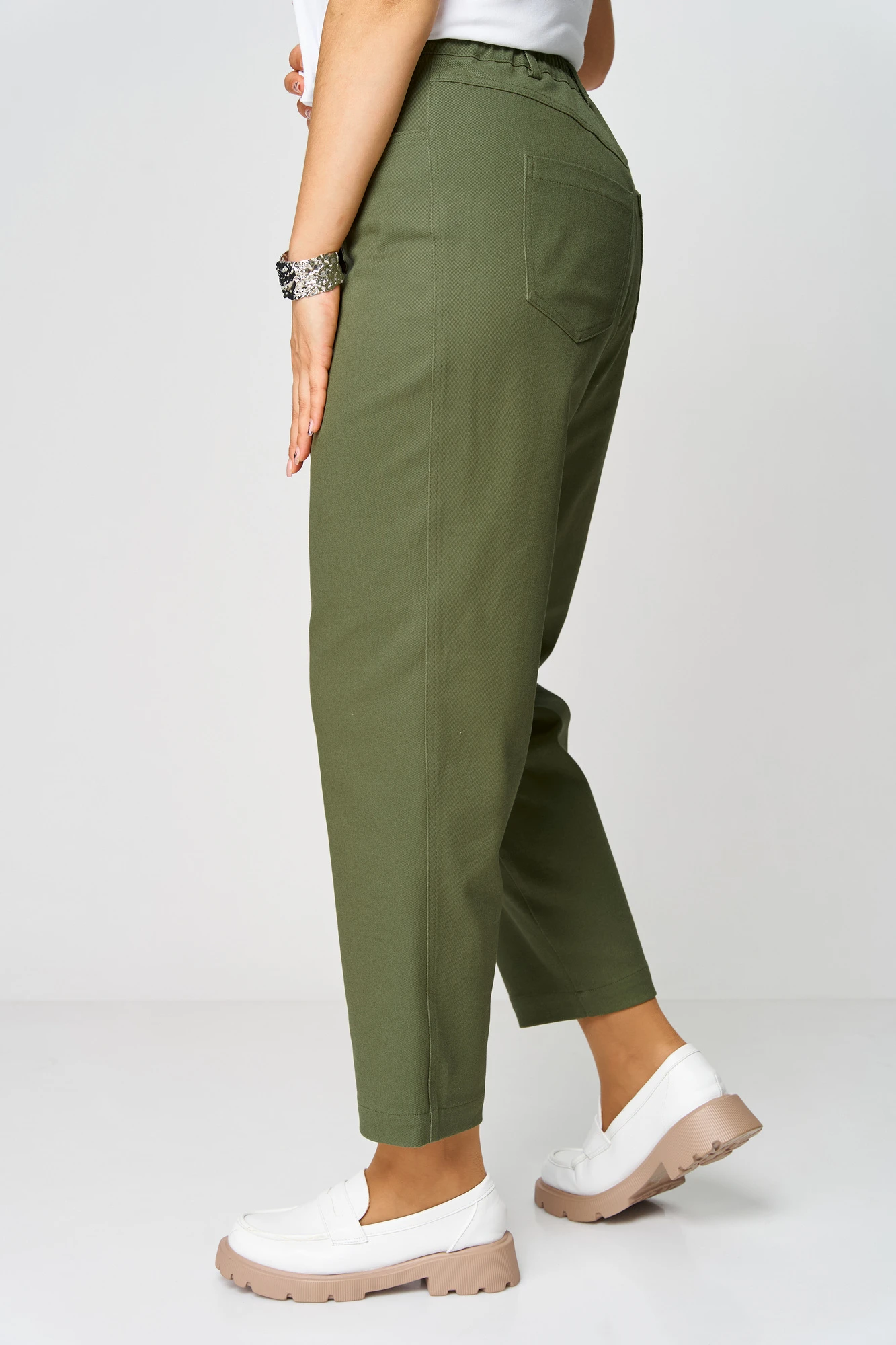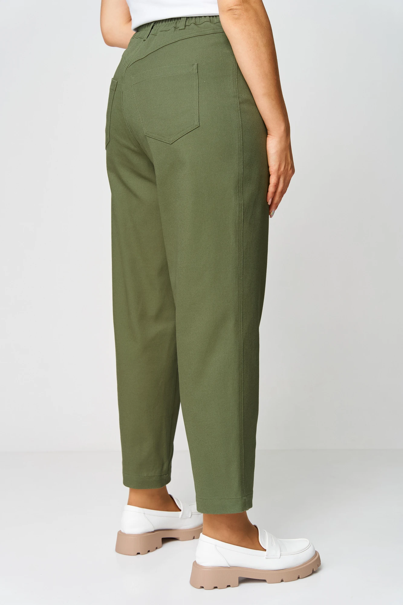 Брюки женские из джинсовой ткани свободного силуэта с высокой посадкой! ("брюки-бананы"). По переду расположены карманы. На задней половинке отрезная кокетка и накладные карманы. Пояс притачной со шлевками. По спинке вставлена резинка. Застежка-гульфик на молнию и пуговицу.