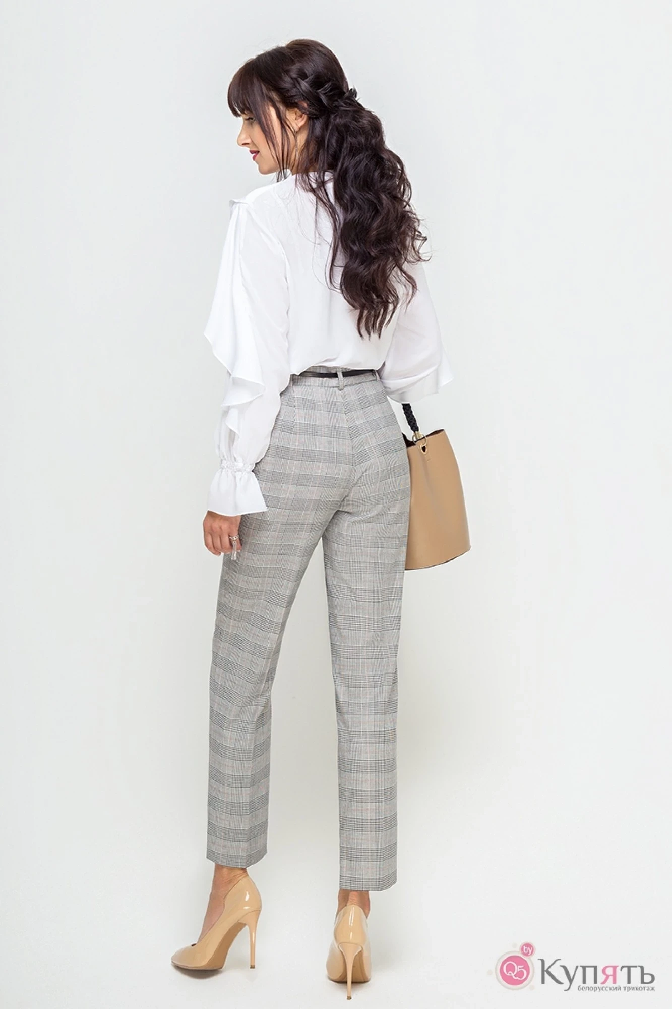 Брюки полуприлегающего силуэта, из брючной эластичной ткани. По переду карманы с отрезными бочками. По задним половинкам брюк таллиевая вытачка. Застёжка на тесьму- молнию. Верхний срез обработан притачным поясом со шлёвками, ширина пояса 4 см. По поясу спинки от бокового до вытачки вставлен резинка, обеспечивающая хорошую посадку по талии. Задние половинки брюк длиннее передних. С внутренней стороны снизу брюк разрез. Этот элемент позволит хорошо лечь брюкам на обувь на каблуке, так и на низком ходу. В комплект входит съёмный пояс.