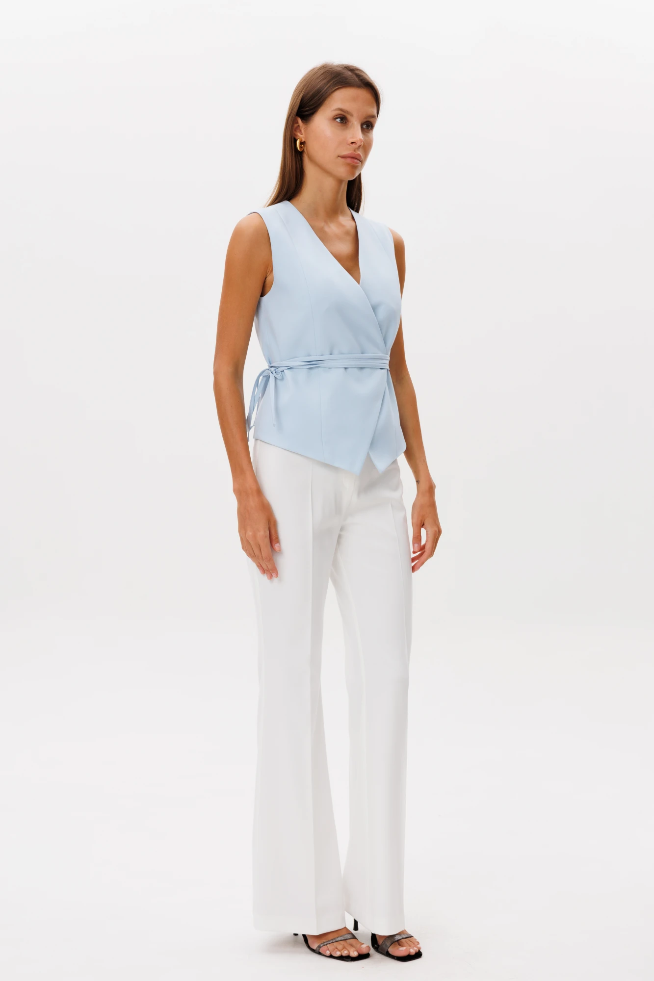 "Классические расклешенные брюки полупрелегающегоьсилуэта с высокрй посадкой, пояс притачной со шлевками, застежка на молнию и петлю-пуговицу, брюки без карманов. Выполнены из ткани костюмной группы.