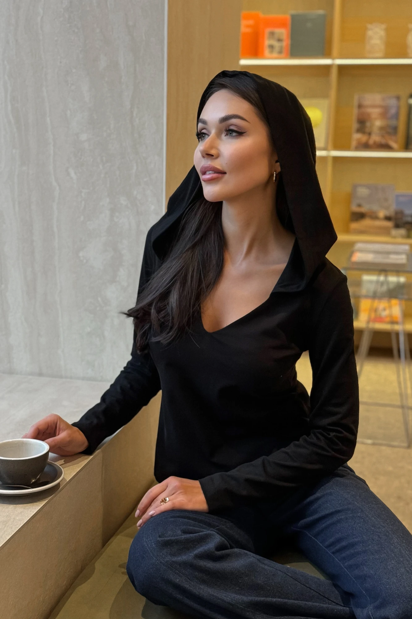 Джемпер выполнен из классического полотна средней потности. Глубокий вырез на лифе придаёт образу женственность. Обработан глубоки й притачной капюшон. Рукав втачной, прямой