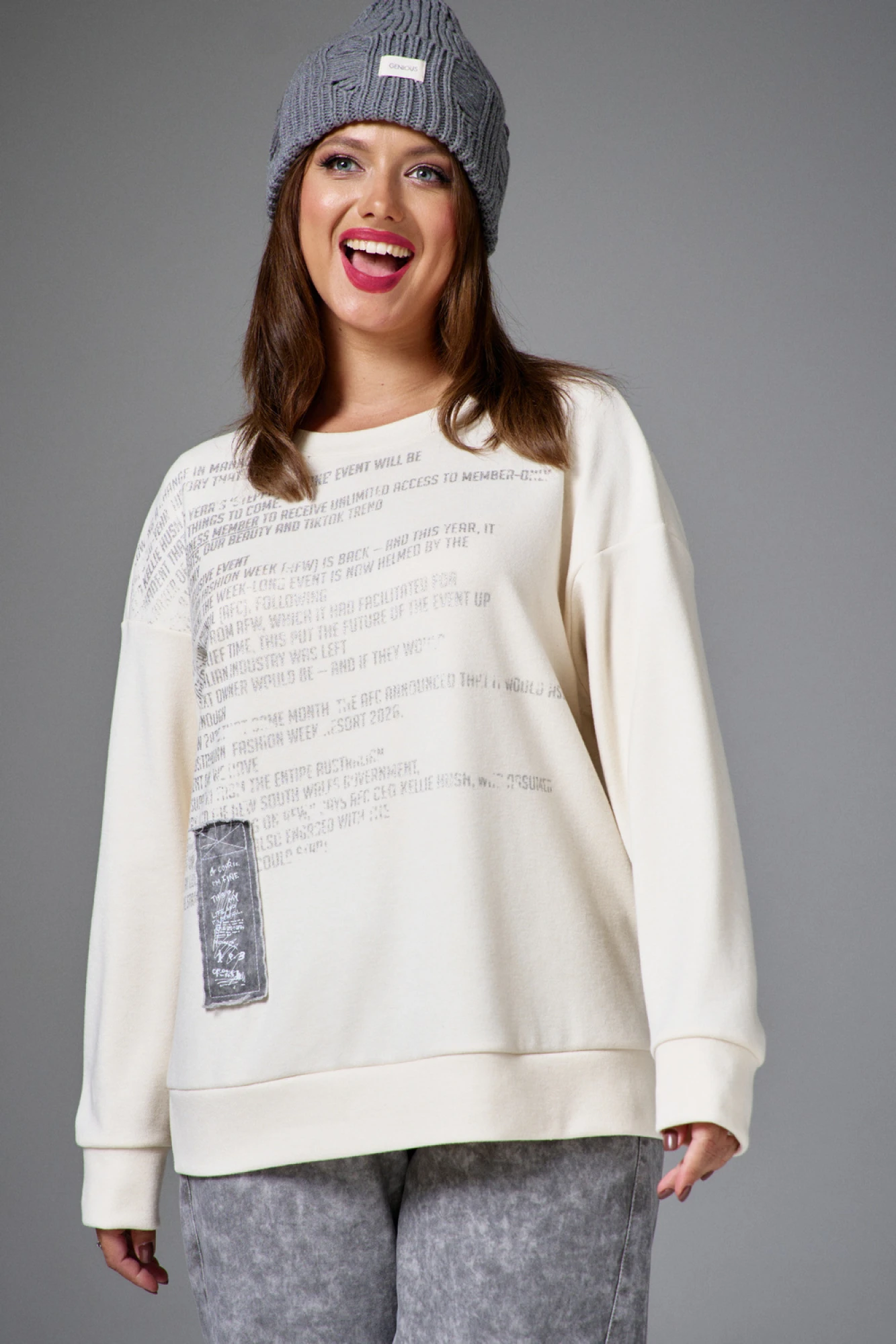 Свитшот из мягкого бархатистого трикотажа, свободного силуэта, с длинным рукавом и круглой горловиной. По низу рукавов и изделия притачные манжеты. Свитшот декорирован авторским принтом и джинсовыми нашивками с необработанными срезами.
