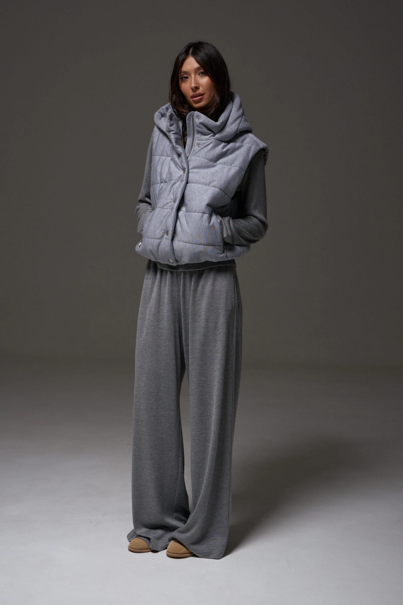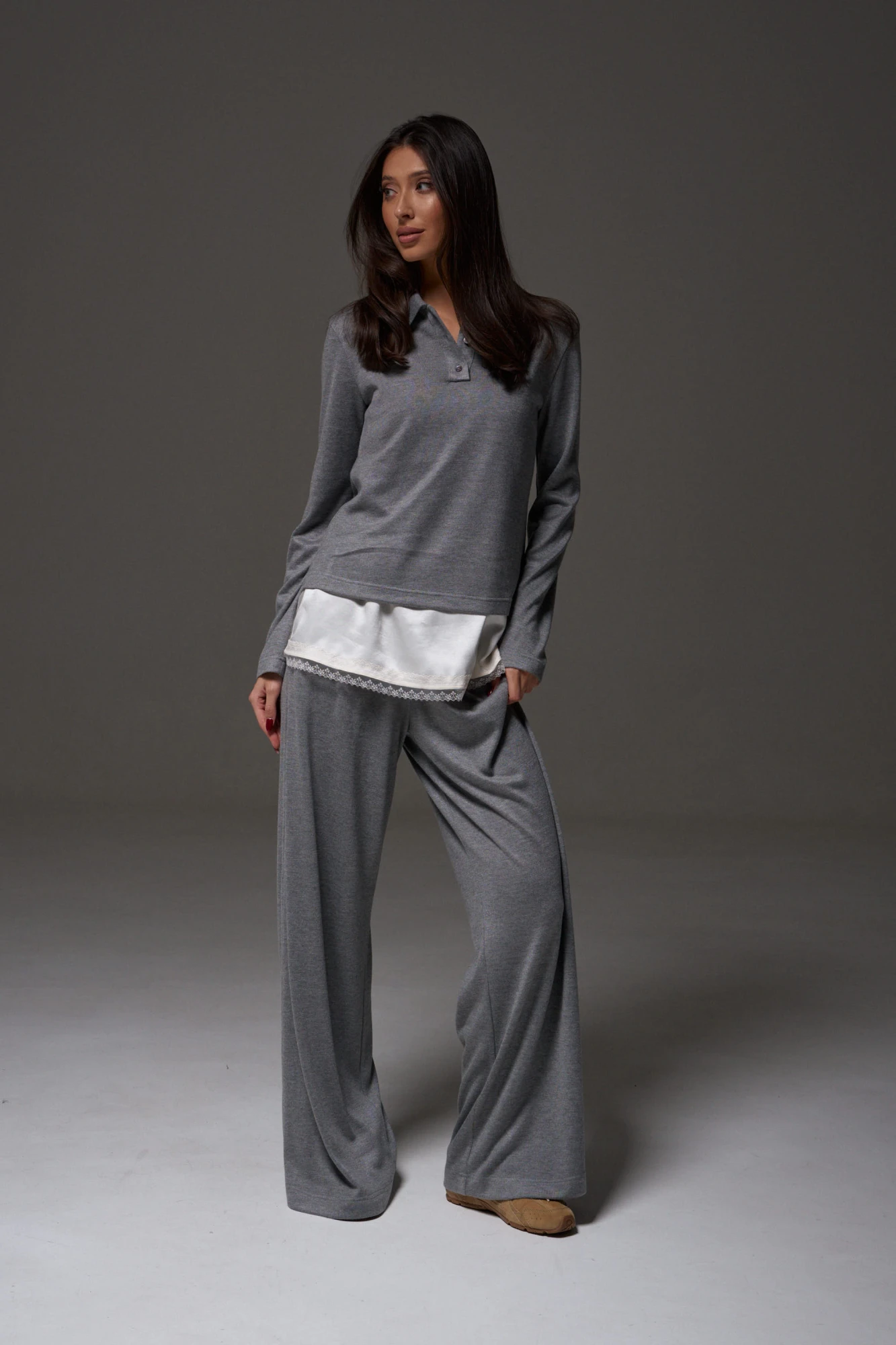 Джемпер прямого кроя. Выполнен из мягкого трикотажного полотна. Отложной воротник. В области горловины застежка на планке на петли пуговички. Рукав втачной. Длина рукава от края горловины 73 см. Длина спинки 56 см