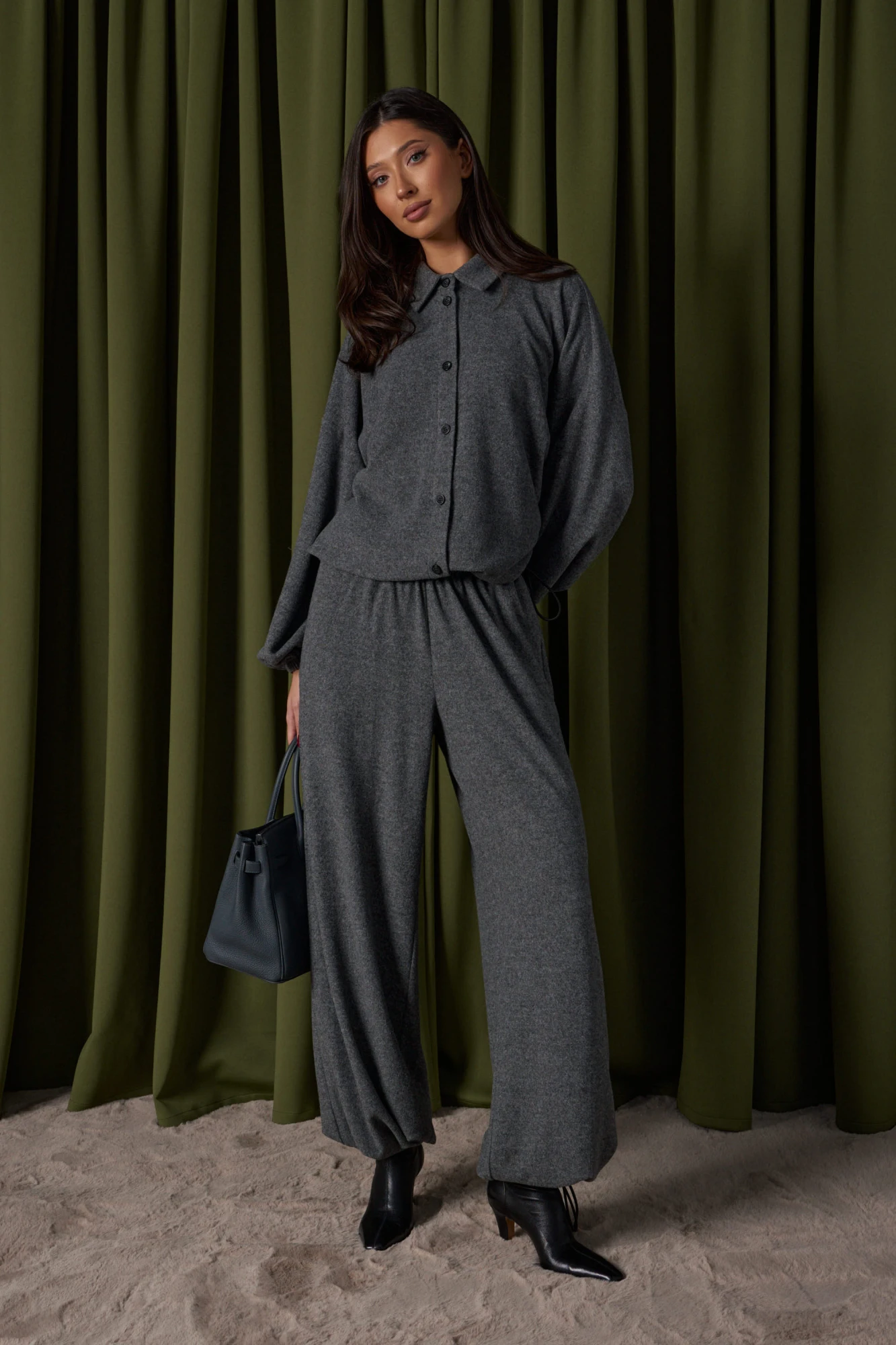 Джемпер прямого кроя, выполнен из трикотажного ворсистого полотна серого цвета. Характеристика: прямой крой, воротник стойка, застежка центральная планка на петли-пуговицы, по низу изделие собирается на резинку с фиксаторами, рукав втачной на резинке, немного спущен. Длина рукава от края горловины 75 см, длина изделия по спинке 65 см.
