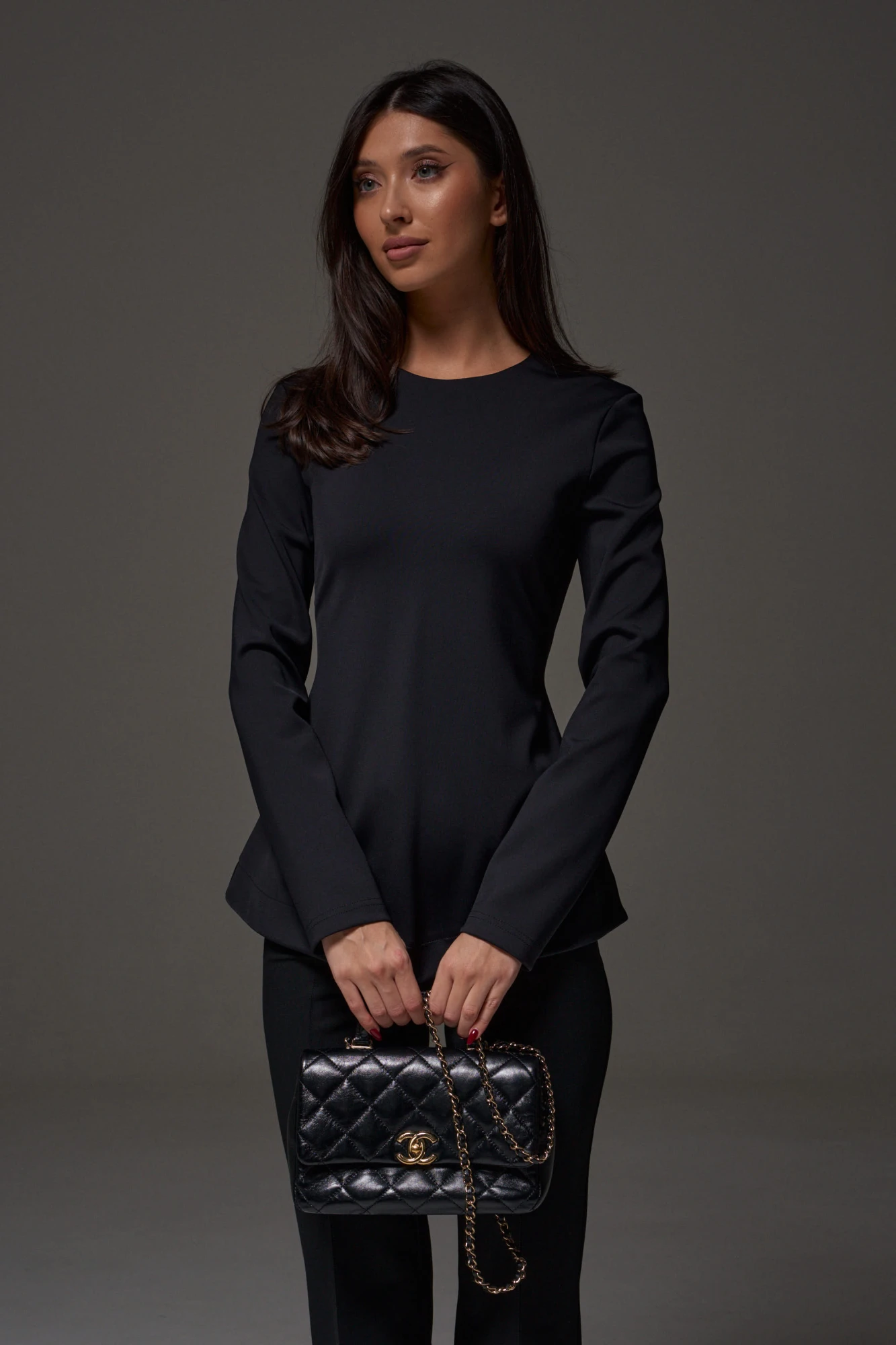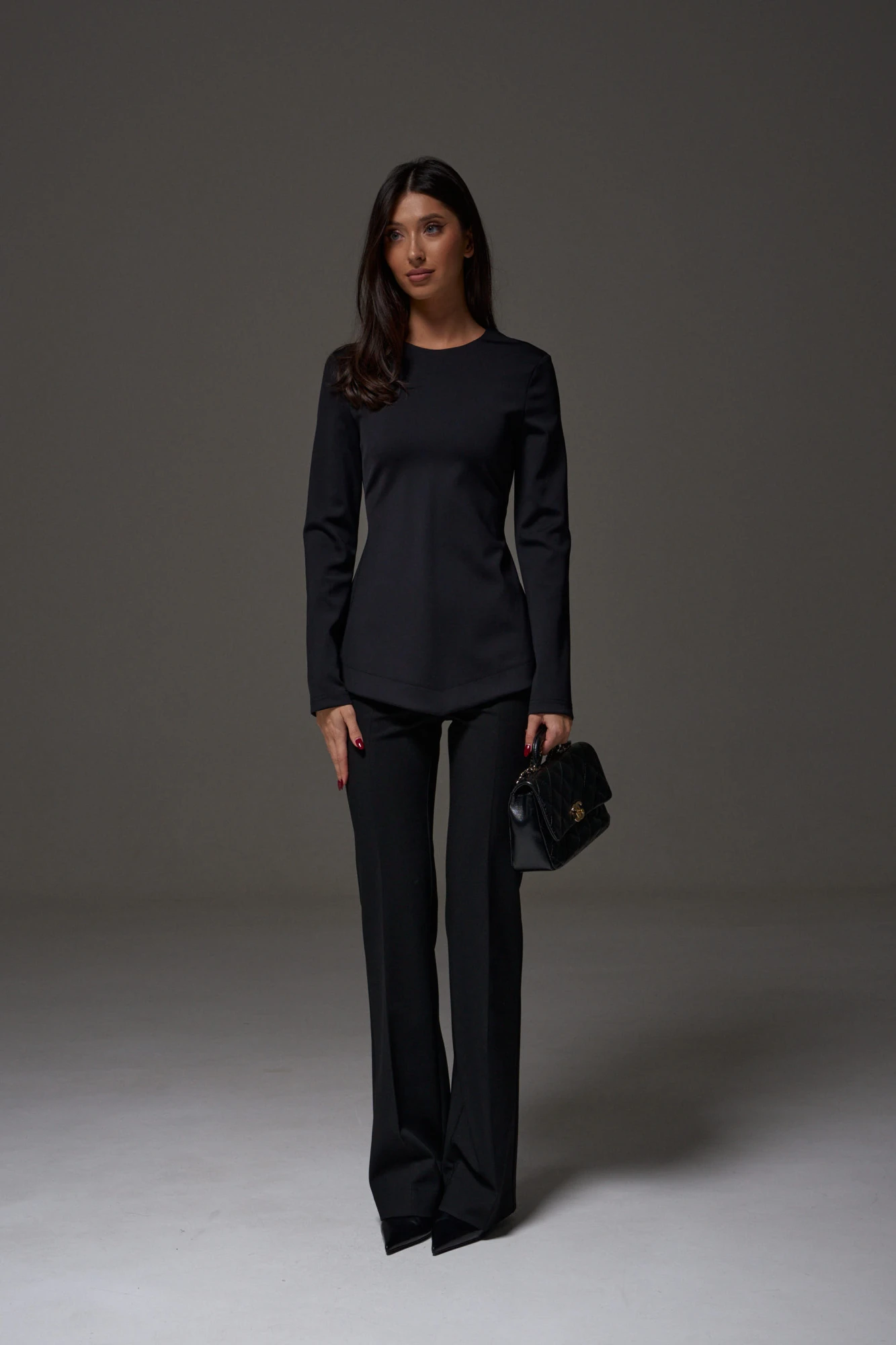 Джемпер приталеного кроя выполнен из полотна ткани черного цвета. Характеристики: плотная ткань водолаз, приталеный крой, овальный вырез горловины, рукав втачной, прямой, на спине потайная молния. Длина по спинке по центральной части 68 см, длина рукава 63 см.