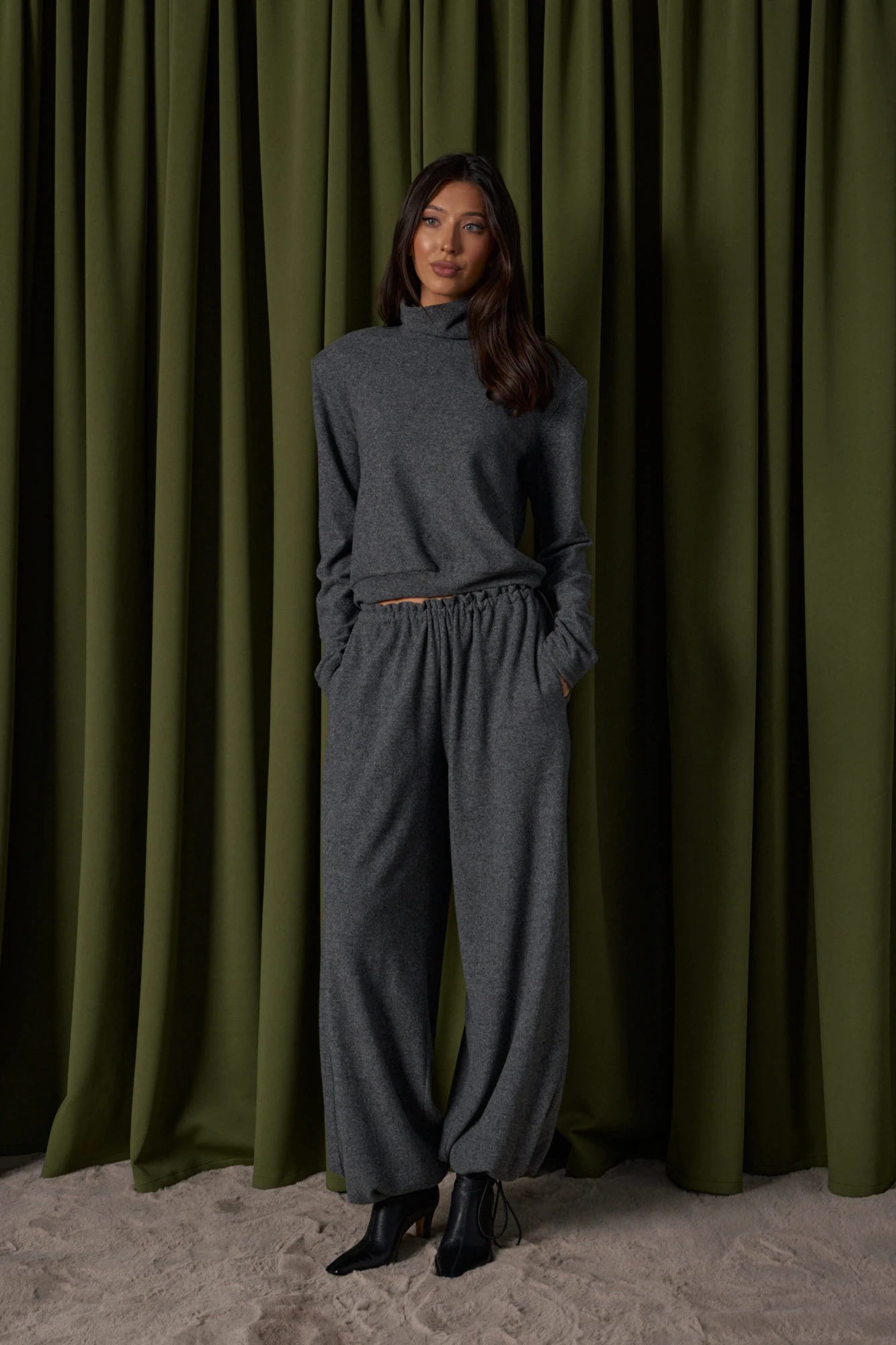 Джемпер укороченный прямого свободного кроя. Выполнен из мягкого трикотажа светло-серого цвета. Горловина-стойка, в естественную складку. Есть подплечники (съёмные). Длина рукава от линии втачивания 61 см. Длина спинки 50 см
