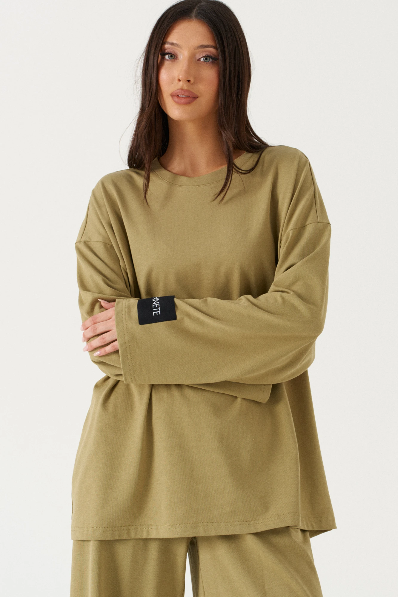 Джемпер прямого свободного кроя,выполнен из ткани шоколадного цвета. Характеристики: прямой крой, овальный вырез горловины, спинка цельнокроеная, спущенное плечо, рукав вточной широкий, на левом рукаве брендированная нашивка "Annete". Длина изделия по центру по спинки 75 см, длина рукава от края горловины 70см.