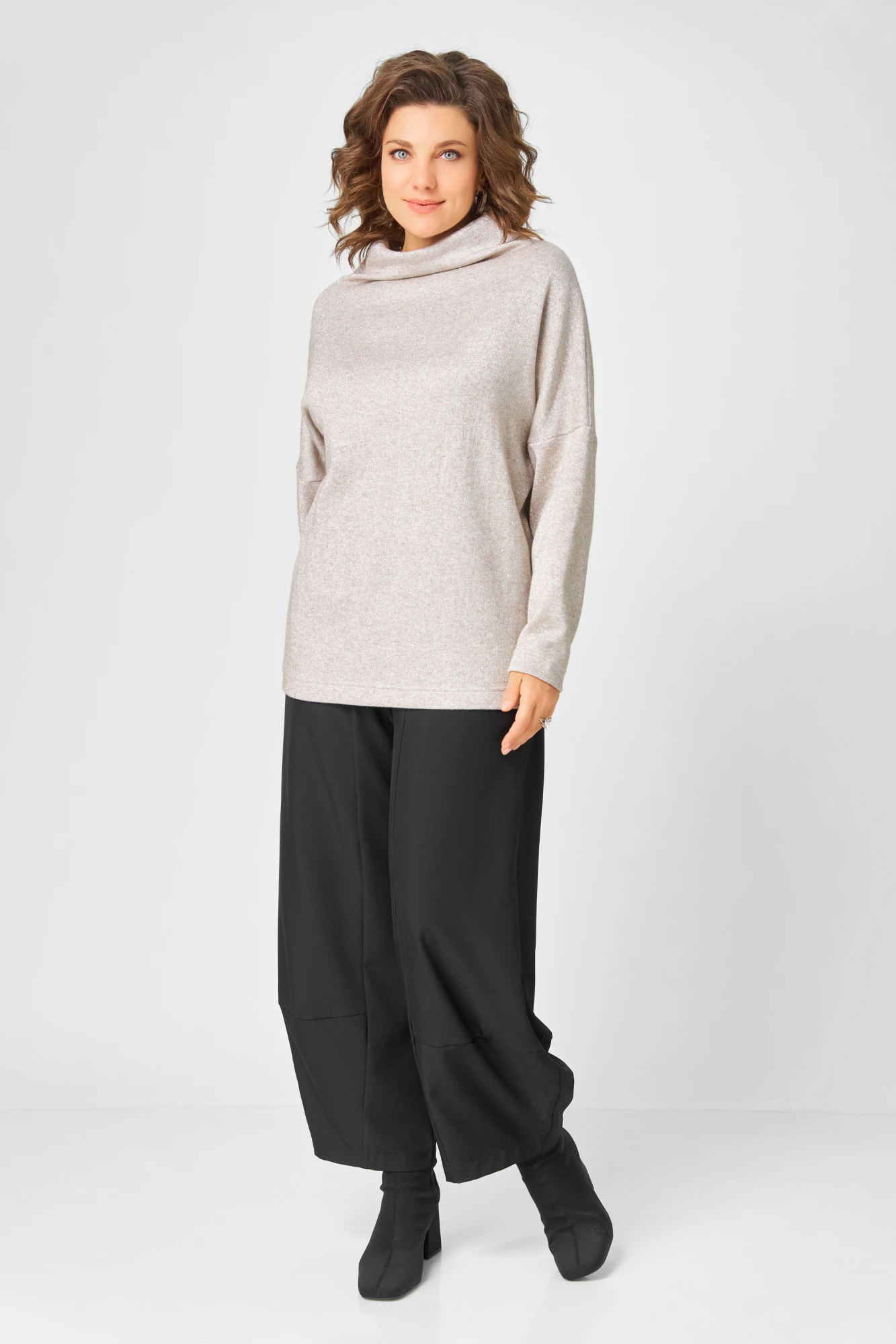 Джемпер прямого кроя с цельнокроеным воротником-стойкой и спущенной линией плеча из приятного к телу трикотажа с люрексом свободного кроя. Укутавшись в наш мягкий джемпер зима будет уютной и тёплой.