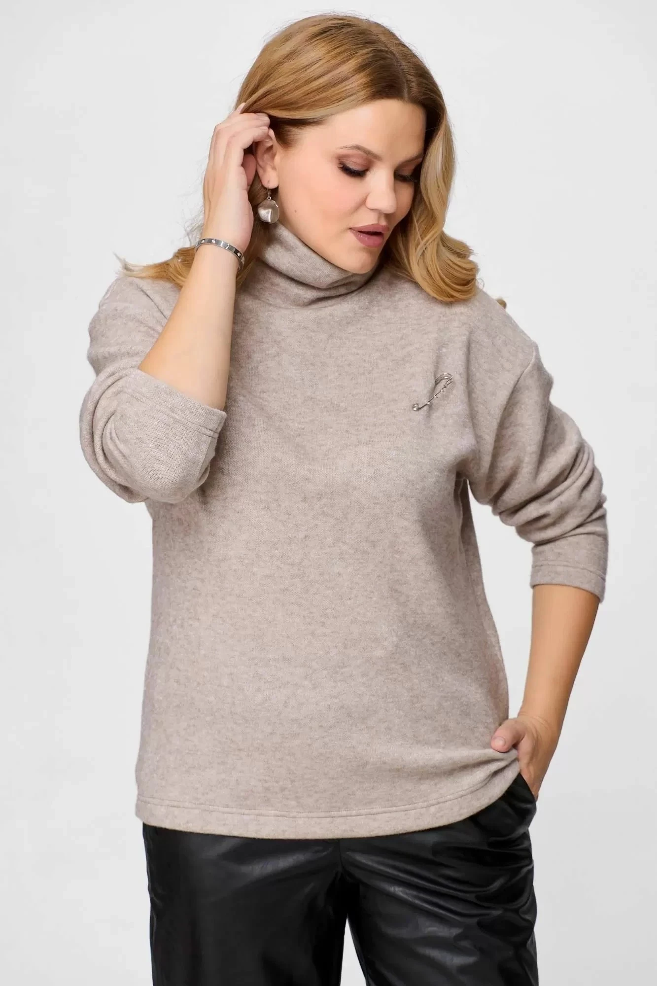Джемпер из приятного к телу трикотажа по типу “Ангора” свободного кроя с брошью. Cохраняет цвет и форму после многочисленных стирок. Укутавшись в наш мягкий джемпер зима будет уютной и тёплой. Высота воротника 13 см