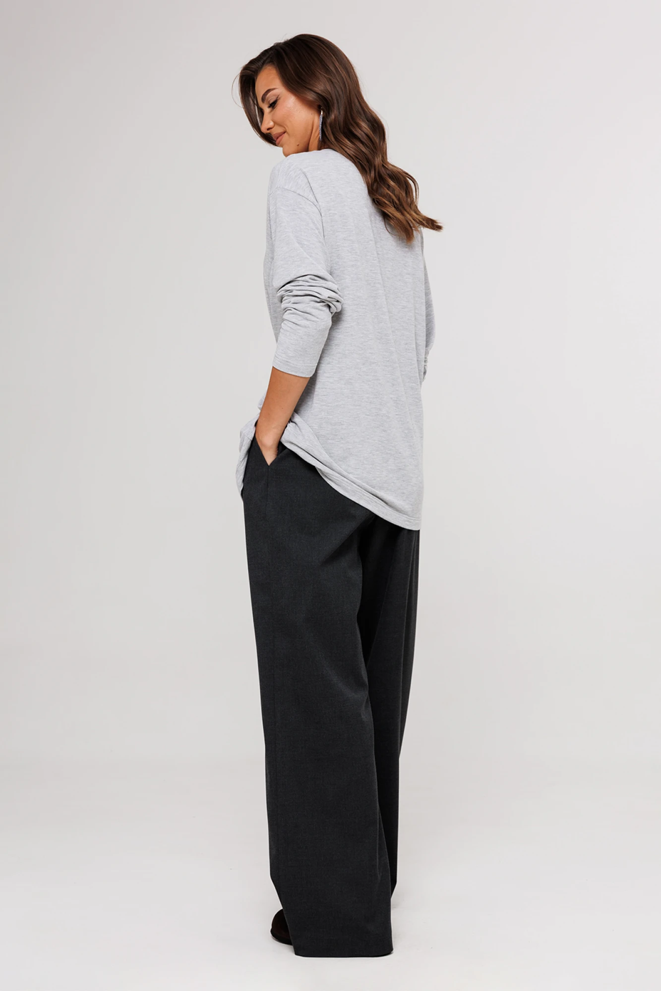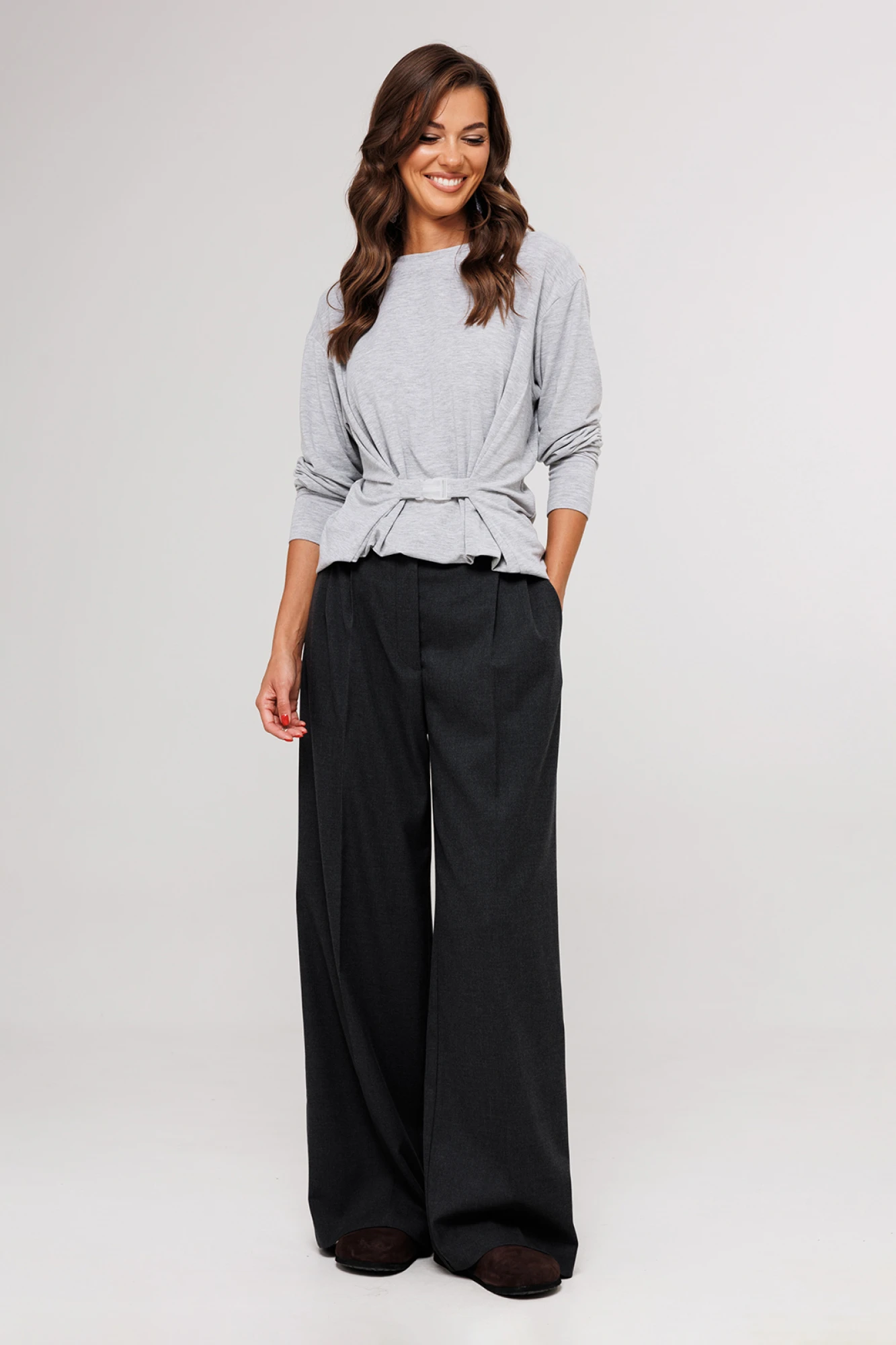 Джемпер трикотажный прямого силуэта со спущенной линией плеча и длинным рукавом. По переду отрезной бочек, в шов которого вставлен фастекс, благодаря чему у джемпера меняется силуэт и образуются дополнительные драпировки. По горловине притачная планка из основной ткани.