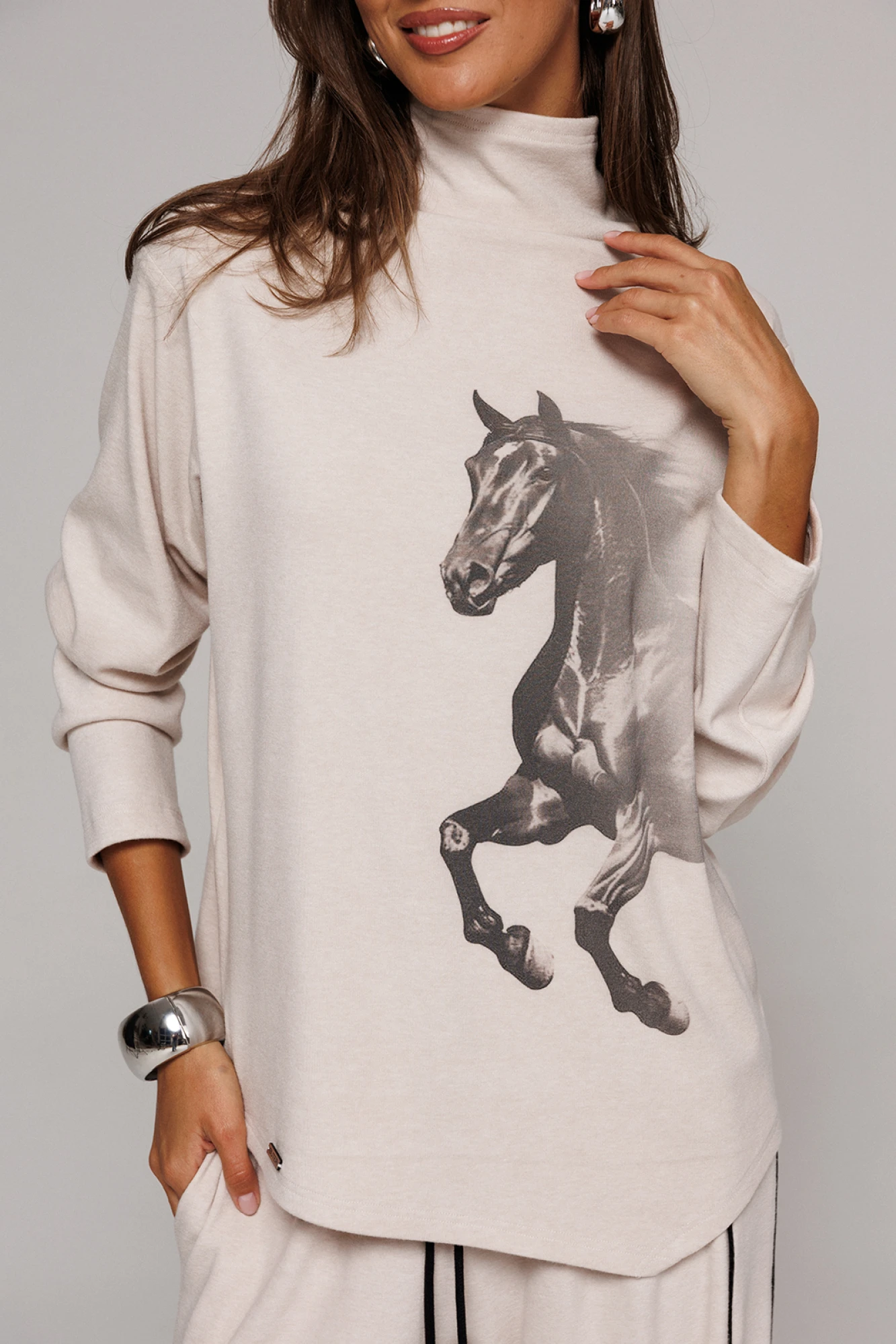 Джемпер из трикотажного полотна с велюровым эффектом прямого силуэта со спущенной линией плеча. Рукав втачной. По переду печать "Лошадь" и нашивка с гравировкой "BUTER". Низ джемпера по переду фигурный ассиметричный. Внизу по правому боковому шву обработан разрез. Воротник-стойка цельнокроеный.